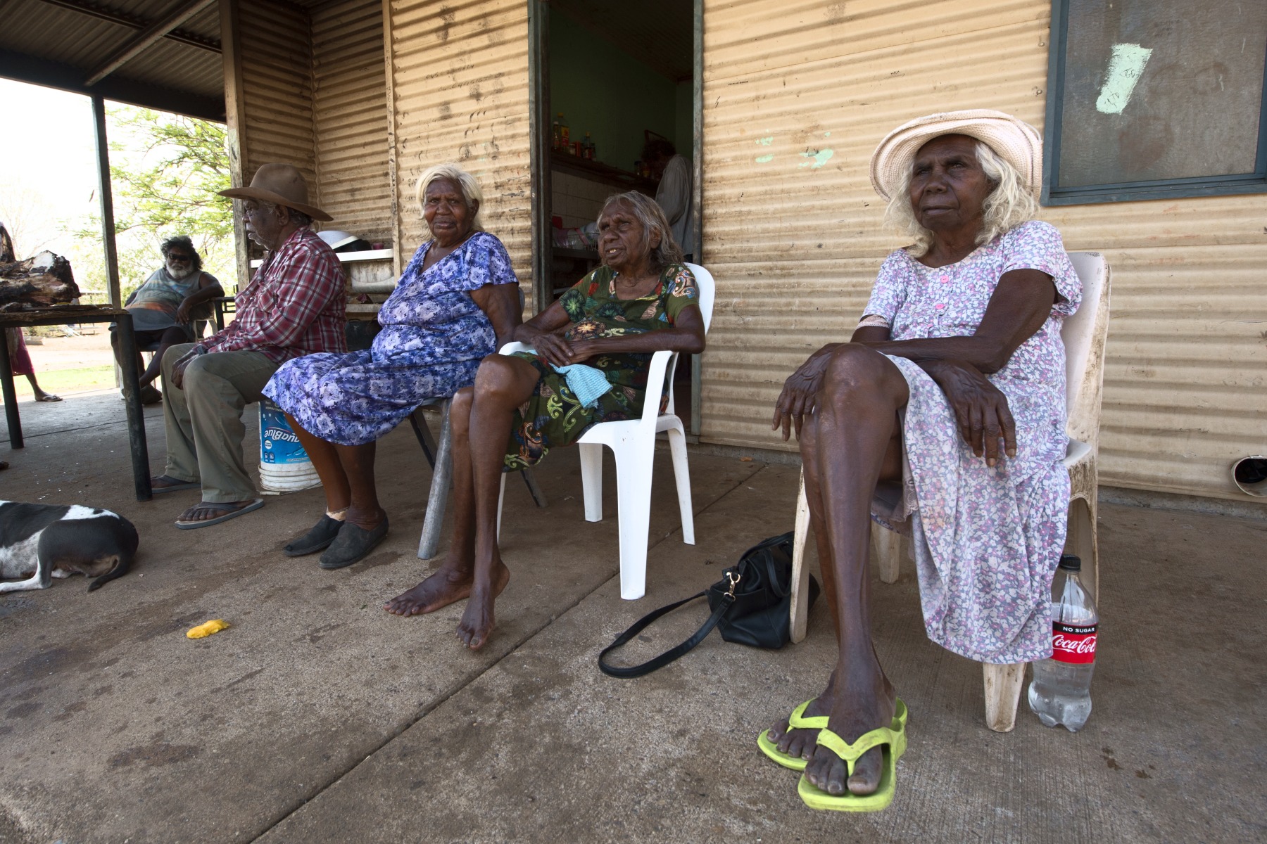 BA2840/1126: Left-right: Charlie Cann with elders Patrick Mung Mung, Nancy Nodea, Mona Ramsay and Betty Carrington in front of Mona Ramsay's home at Juwurlinji Community, Bow River Station, October 2018