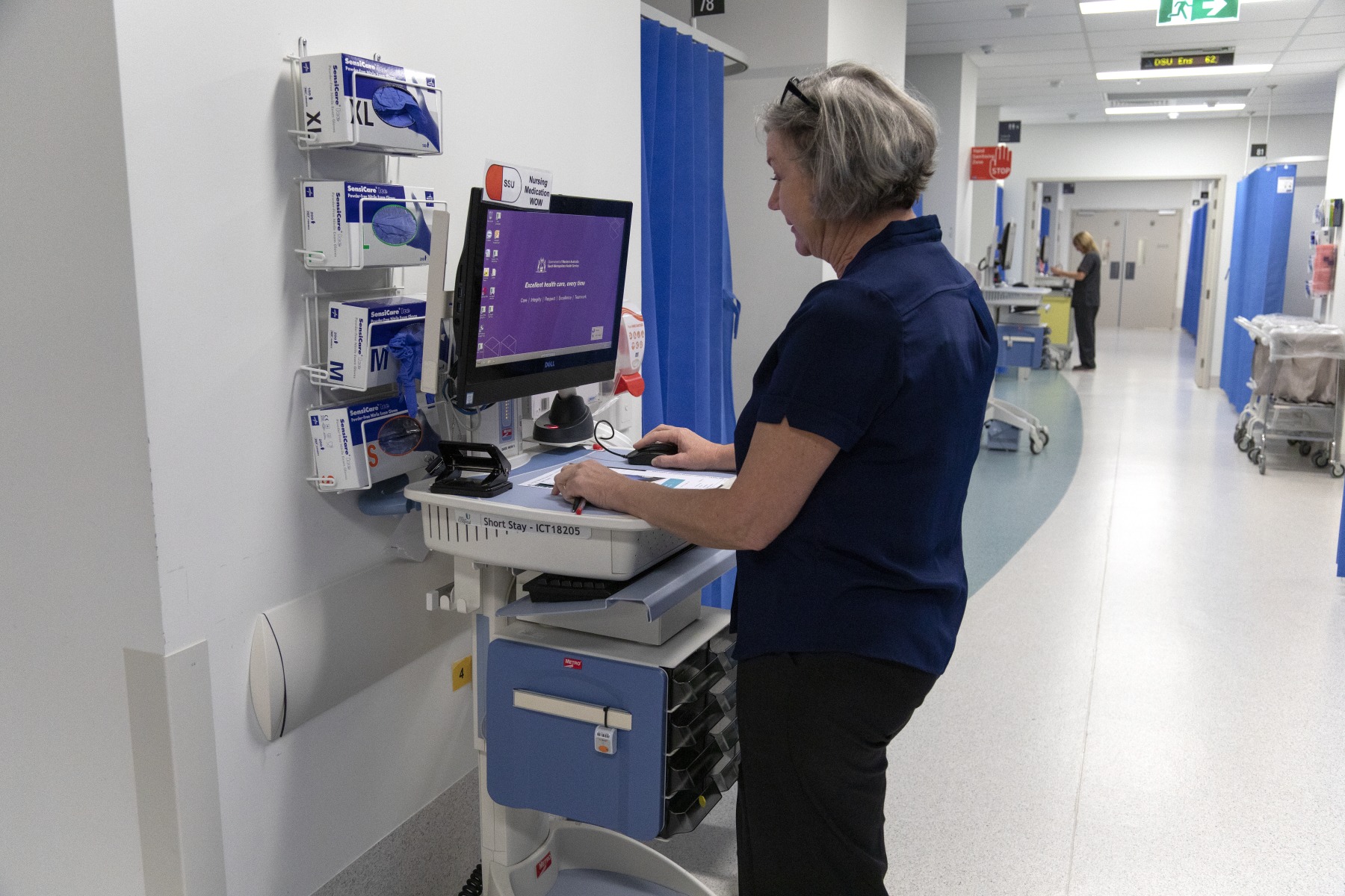 BA2493/2375: A nurse uses a Workstation on Wheels (WOW) in the Fiona Stanley Hospital Day Surgery Unit, Murdoch, 4 July 2019