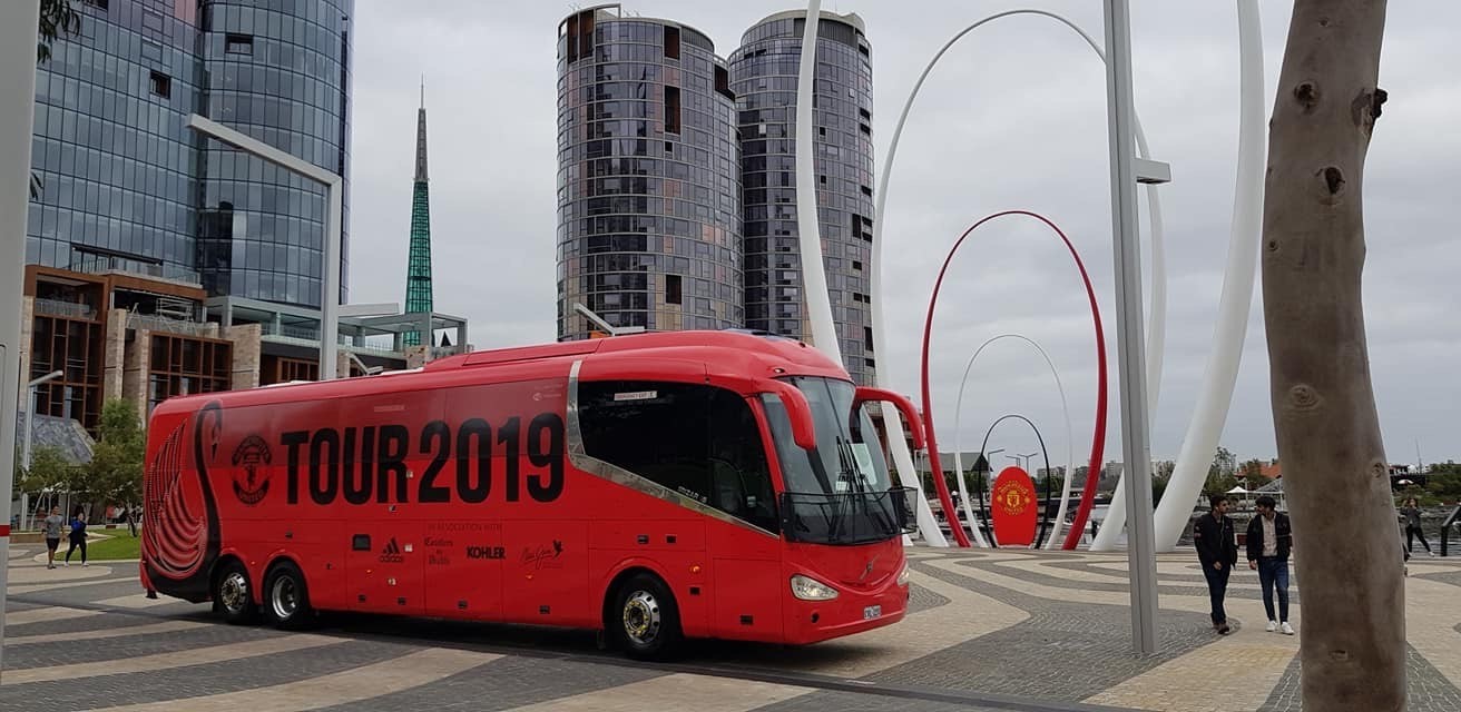BA3126/1: Manchester United's red Perth tour bus at Elizabeth Quay, July 2019