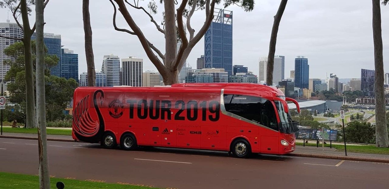 BA3126/2: Manchester United's red Perth tour bus at Kings Park, July 2019