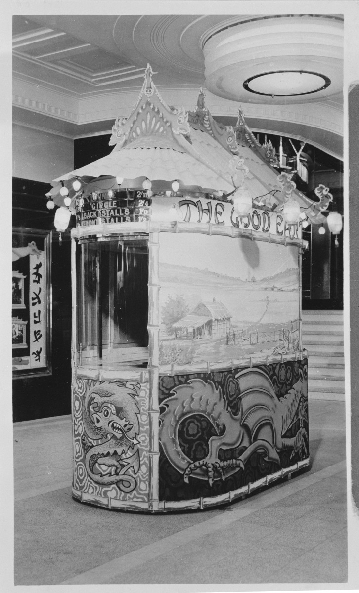 BA3118/4: Ticket booth decorated for the film The good earth at the Piccadilly Theatre, Perth, Western Australia, 1938.