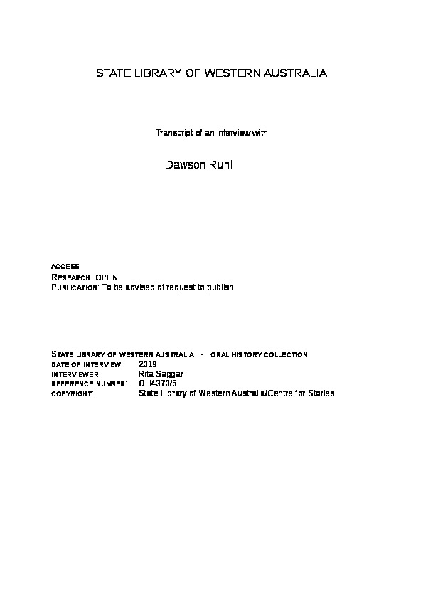 OH4370/5: Transcript. Interview with Dawson Ruhl by Rita Saggar in 2019