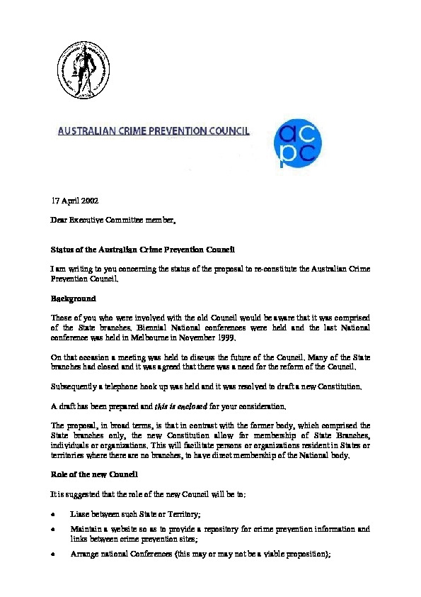ACC 10459AD96 Letter to Committee Status of ACPCWA April 2002