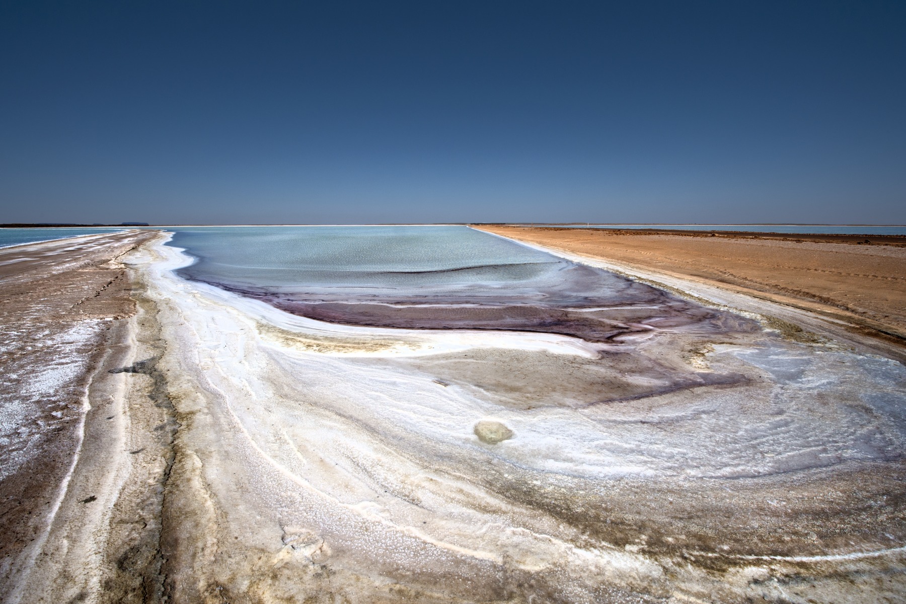 BA2840/1453: The colours out on a crystalliser pond. The dark band is dead algae the wind has pushed to one end of the pond, August 2019