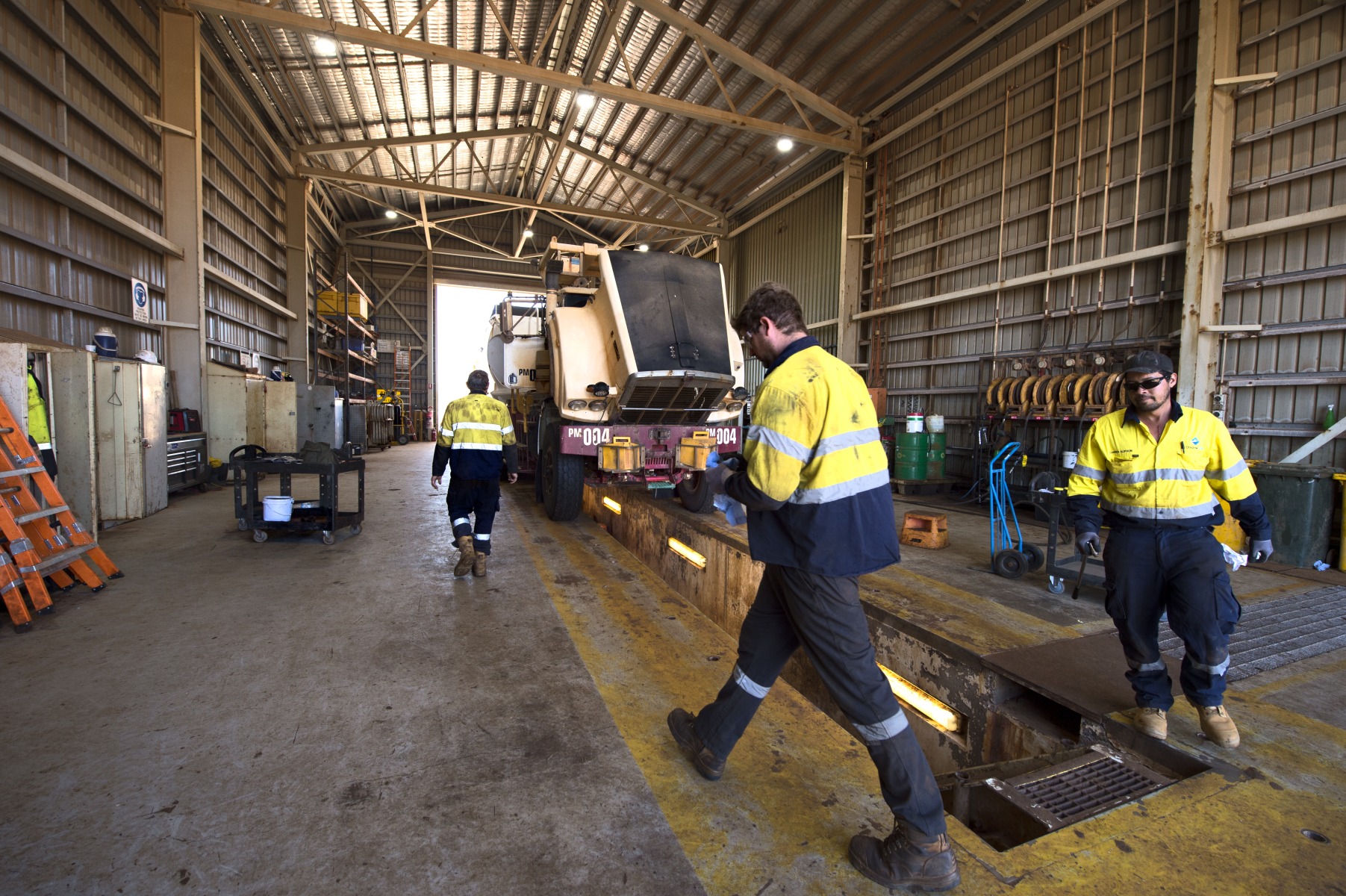 BA2840/1460: The day shift crew of diesel mechanics servicing a harvesting truck at Onslow Salt, August 2019