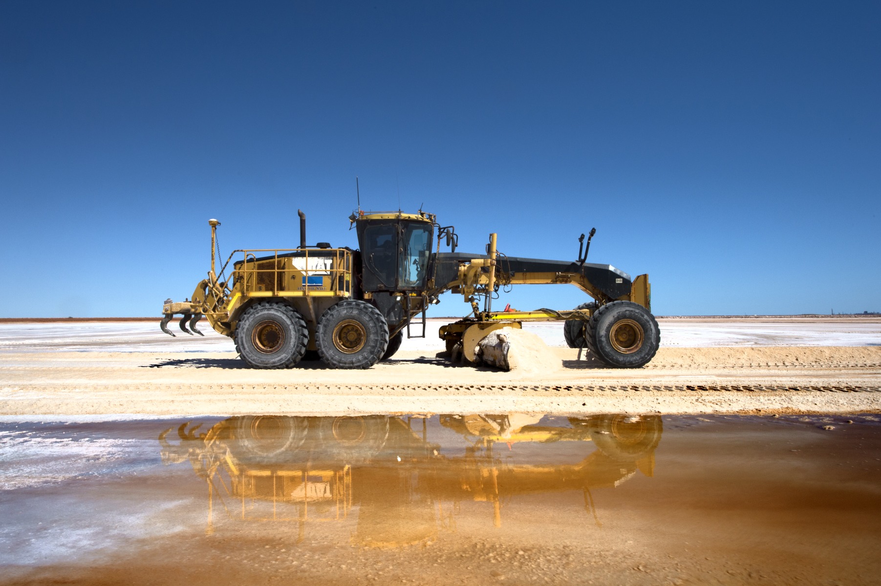 BA2840/1481: Cameron Elliott using a grader to make a track for the belly dumper truck harvesting salt from the crystalliser pond, August 2019