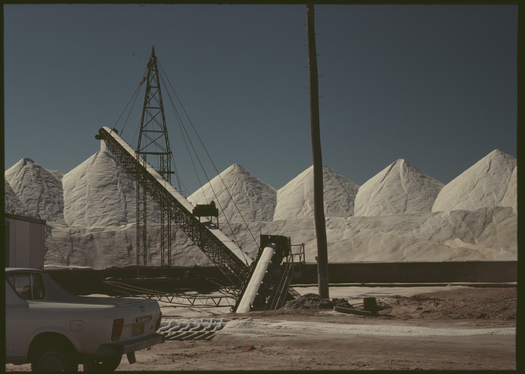 196327PD: Salt piles and conveyors, Useless Loop, Western Australia, August 1980.