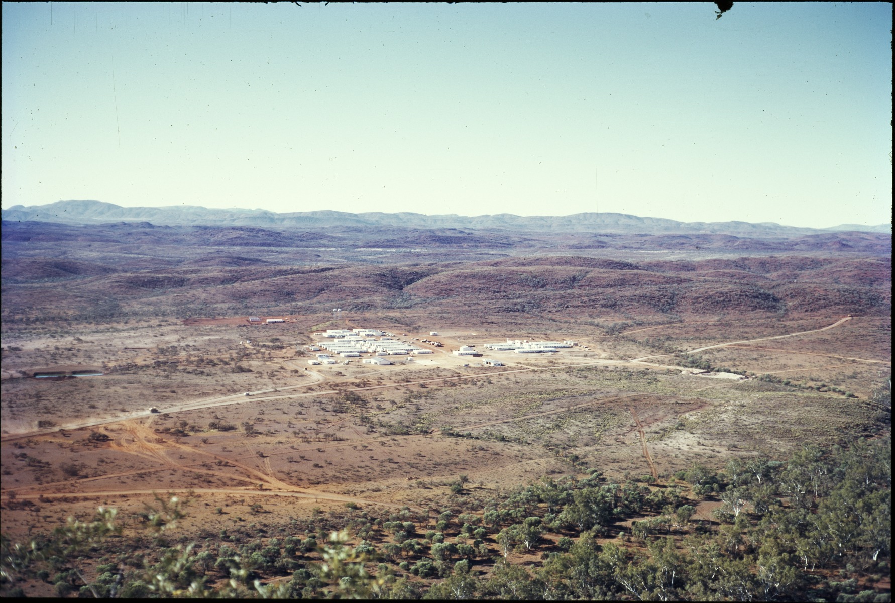 198149PD: View of the Central Engineering Services construction camp and the surround landscape, Paraburdoo, 1970