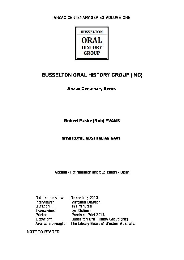 OH4402/7: Transcript. Interview with Robert Paske (Bob) Evans in 2014 interviewed by Margaret Dawson