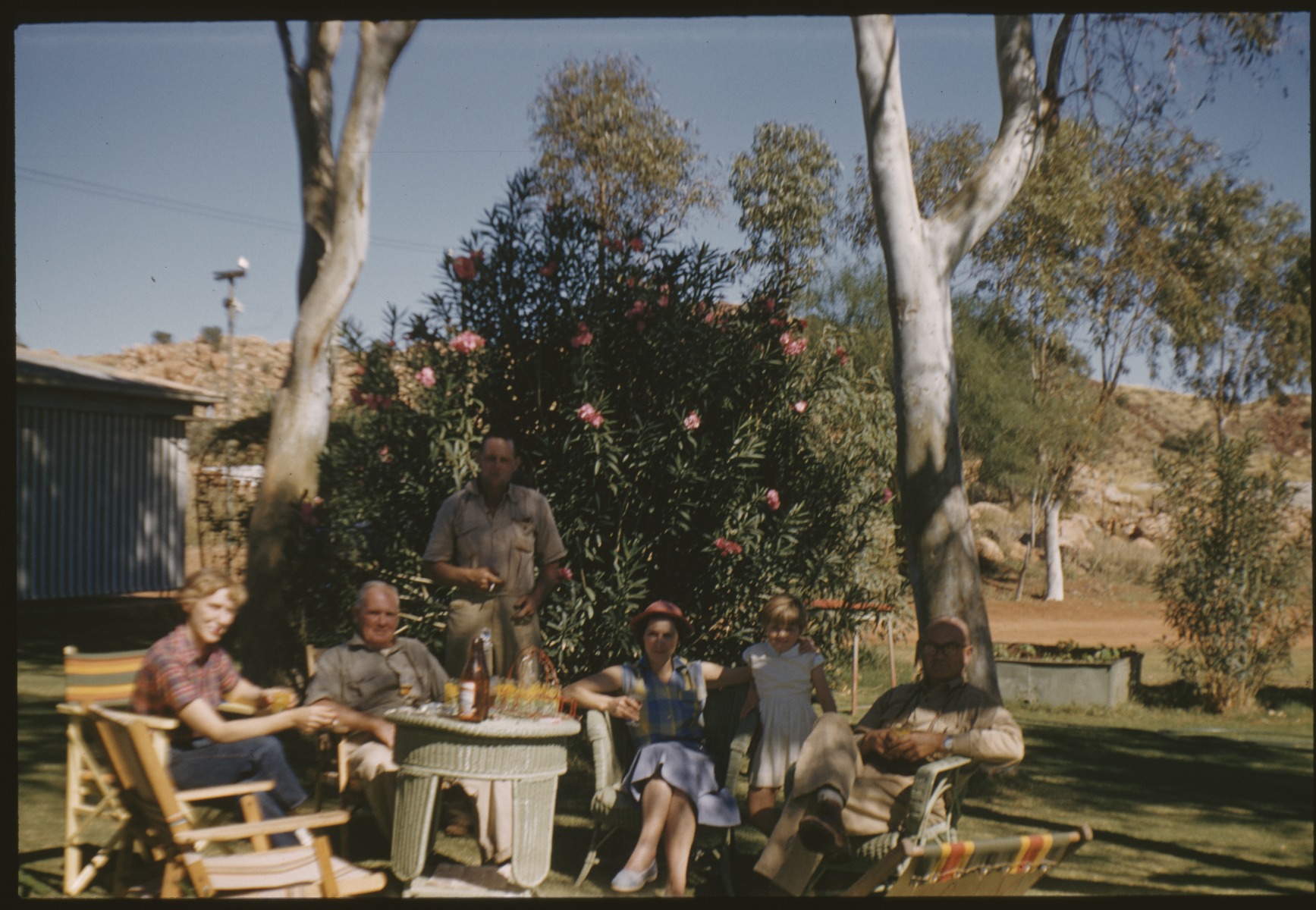 300434PD: Le Souef family, possilby with members of the Leslie family, seated in a garden at Karratha Station, Western Australia, 1956.