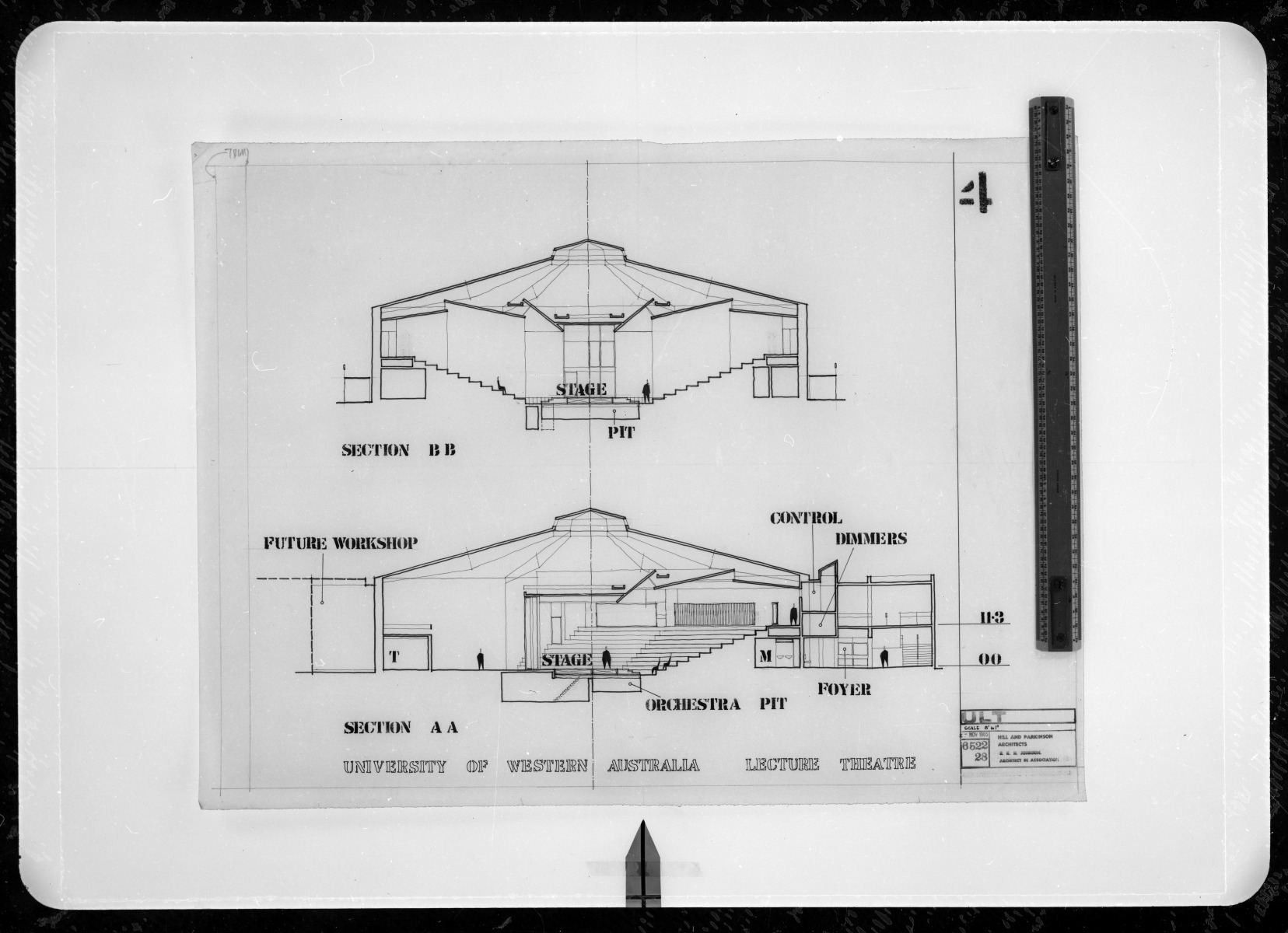 394188PD: Section plans of stage and orchestra pit and foyer, November 1965