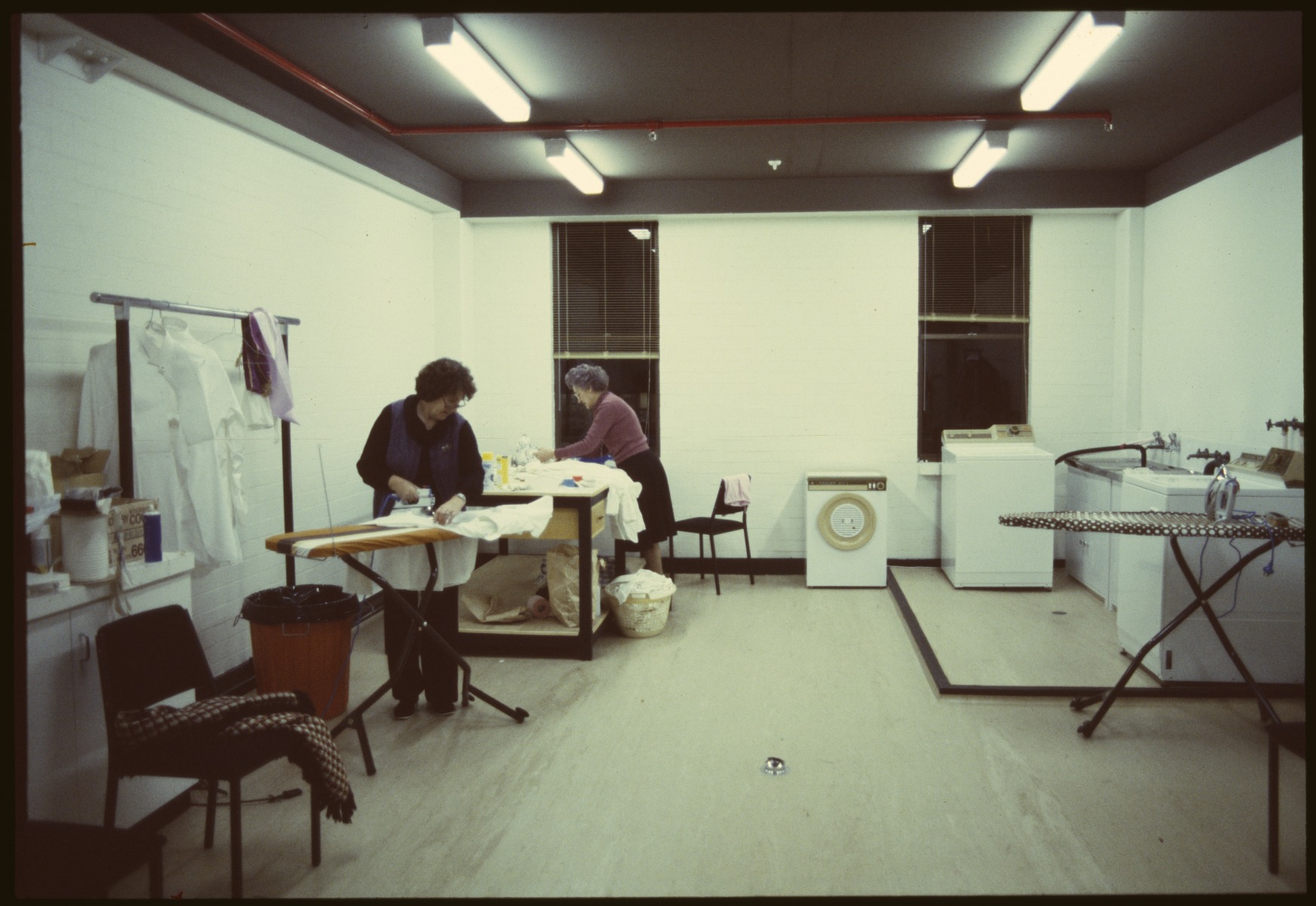 198261PD: The laundry known as 'Wardrobe', 1980. Background is Alma Taylor, head of Wardrobe and at ironing board Betty Bostock