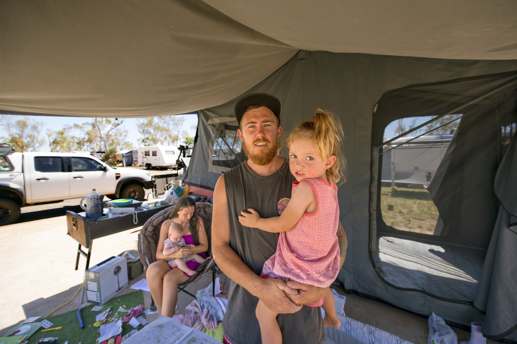 BA2840/1718: Carley Haynes with Roy and Daniel Haynes with Rose in camp at the Discovery Caravan Park, Karratha, 30 March 2020