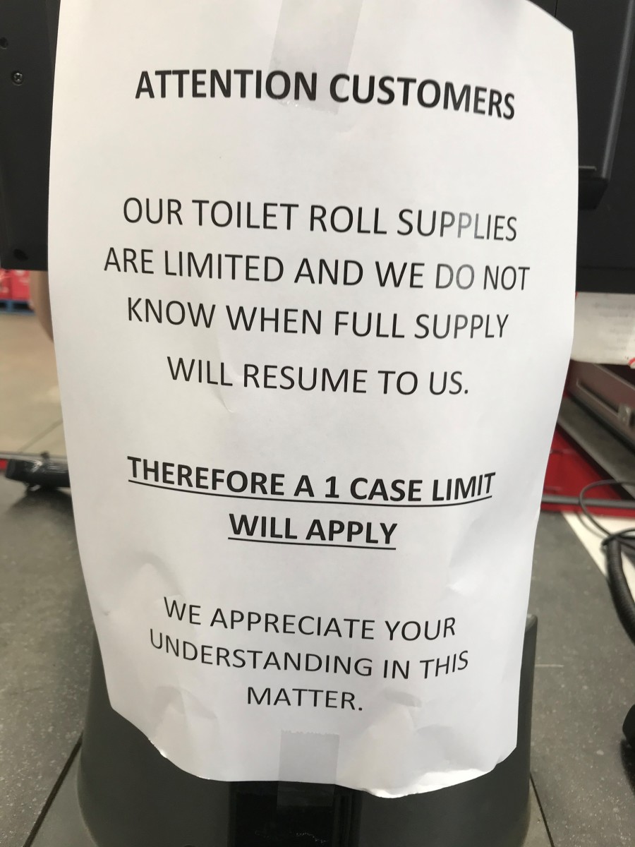 BA3229/1: A sign regarding toilet roll rationing at a wholesale grocery chain in Perth at the beginning of the Covid-19 pandemic in Perth, 6 March 2020.