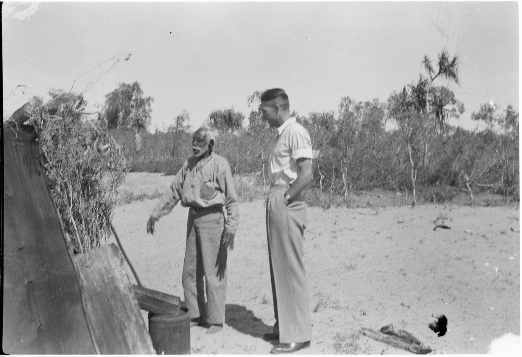 275568PD: Father John Jobst and an Aboriginal Australian man looking at a humpy constructed from corrugated iron, Beagle Bay Mission, Western Australia, 1952.