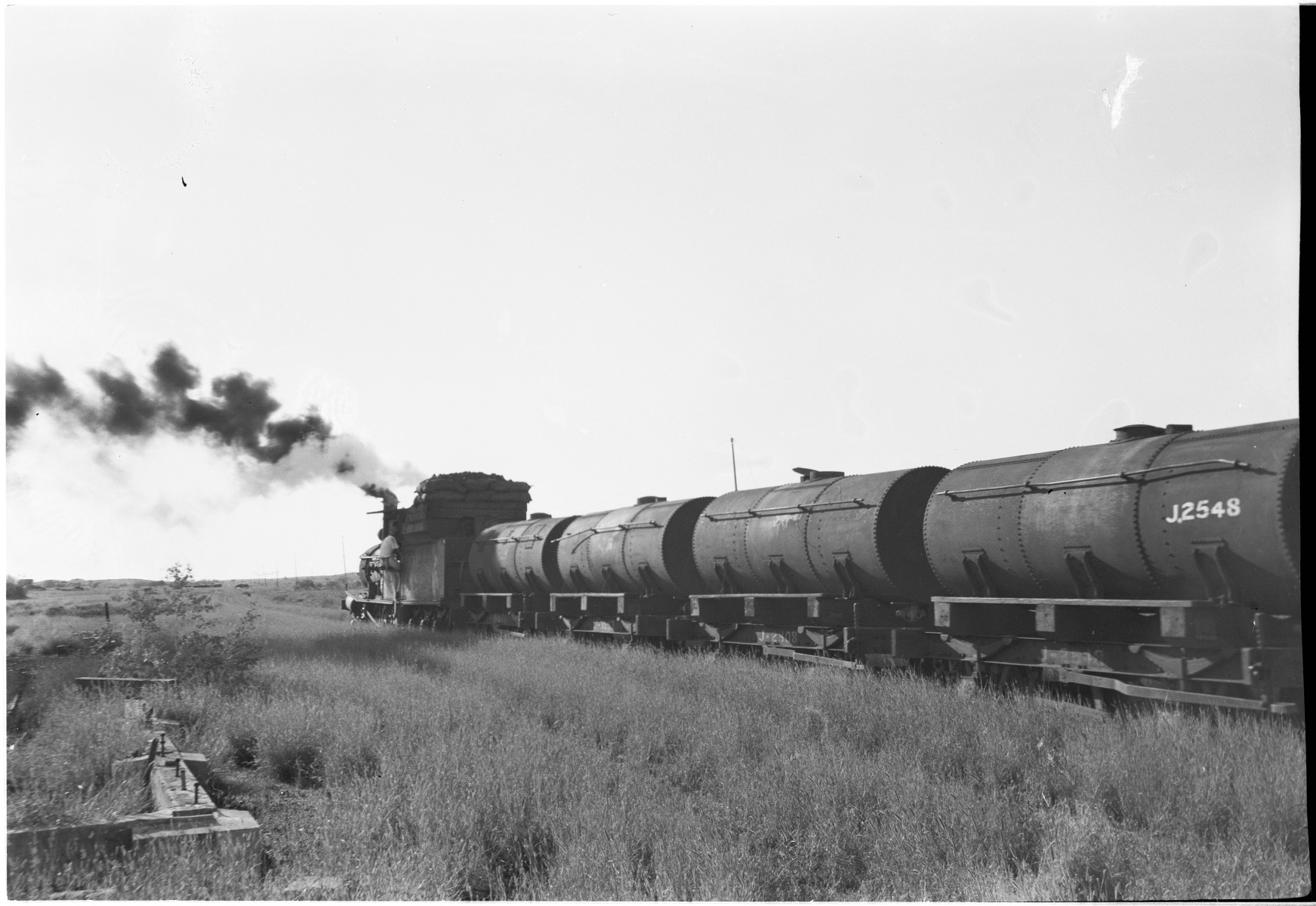 275600PD: Locomotive pulling tank cars, possibly full of water, Port Hedland, Western Australia, 1952.
