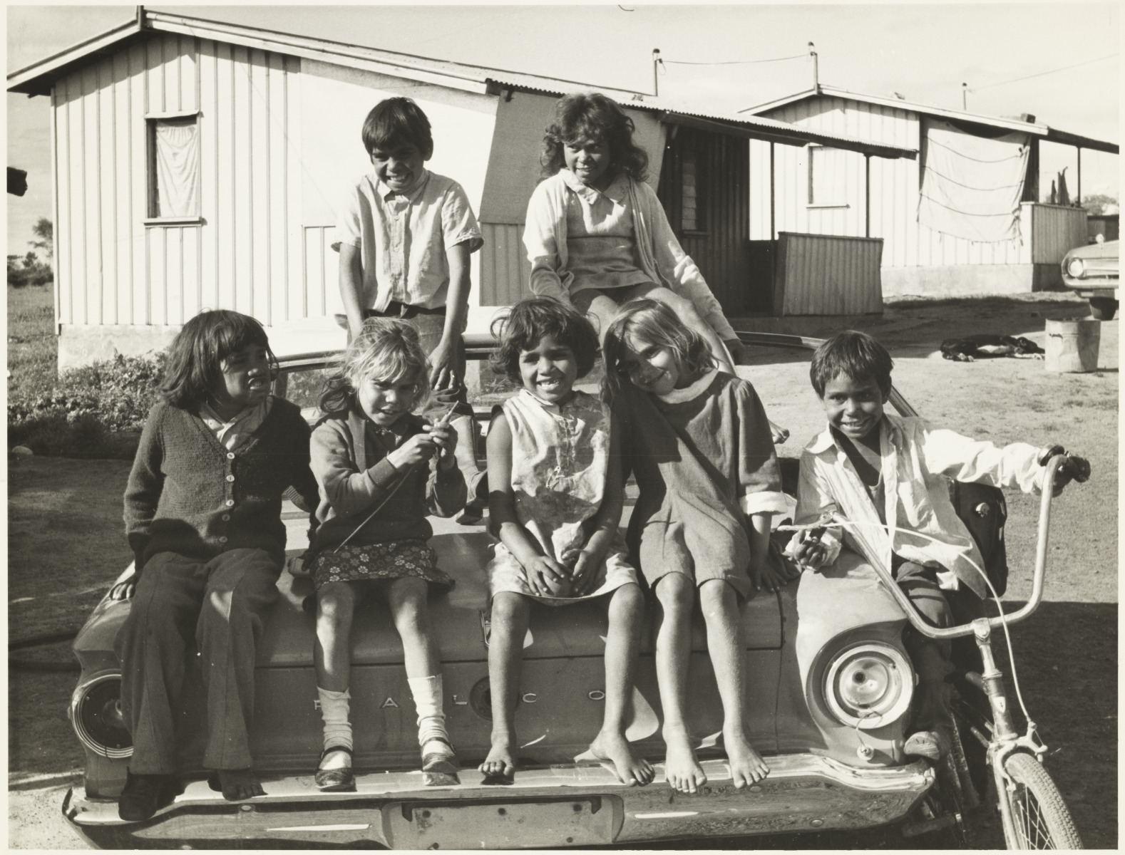 BA3181/1: Children sitting on a car with metal houses behind, probably at an Aboriginal Community in the goldfields, Western Australia, 1983.