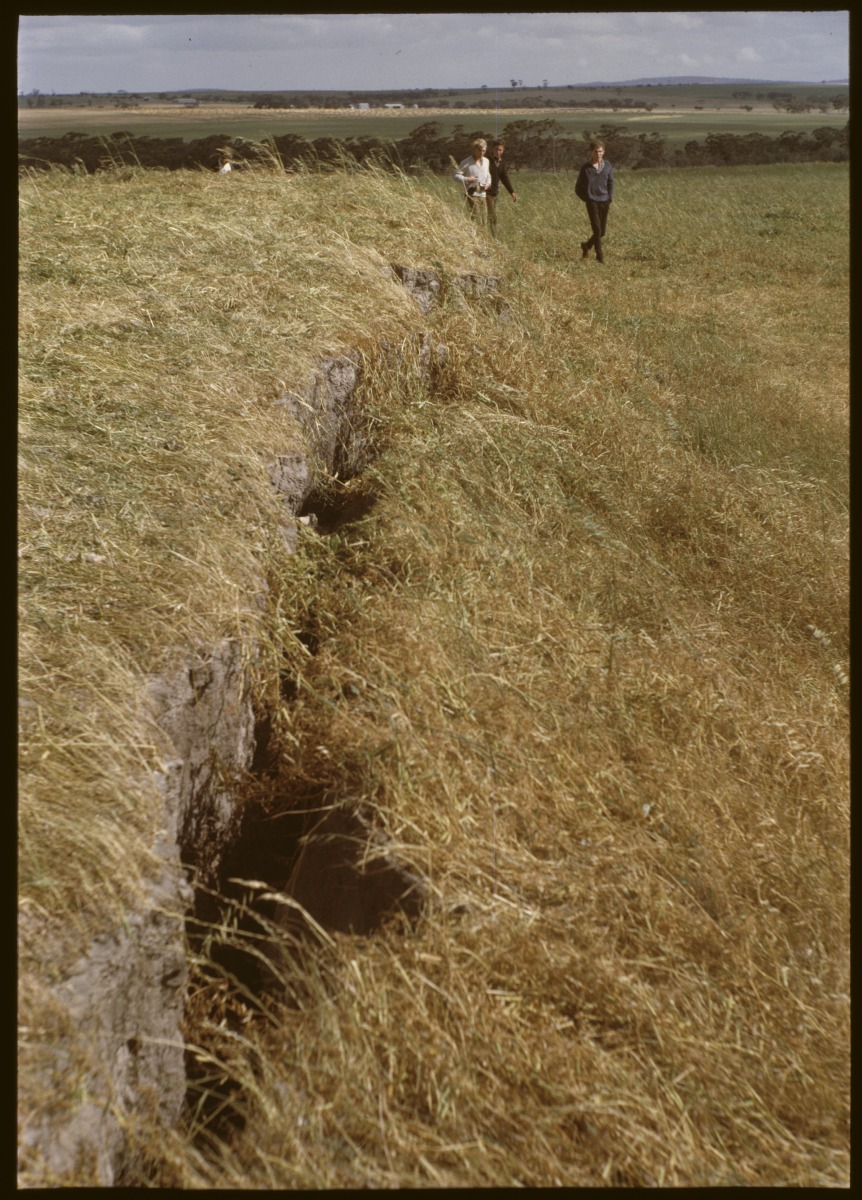 197027PD: Tension cracks in a field, six weeks after the Meckering earthquake, Western Australia, 1968.
