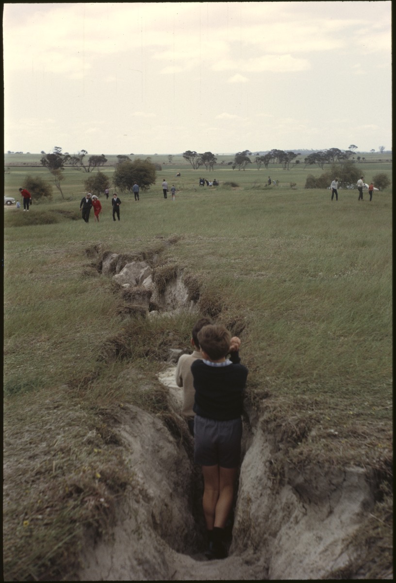 197039PD: Tension cracks in a field, six weeks after the Meckering earthquake, Western Australia, 1968.