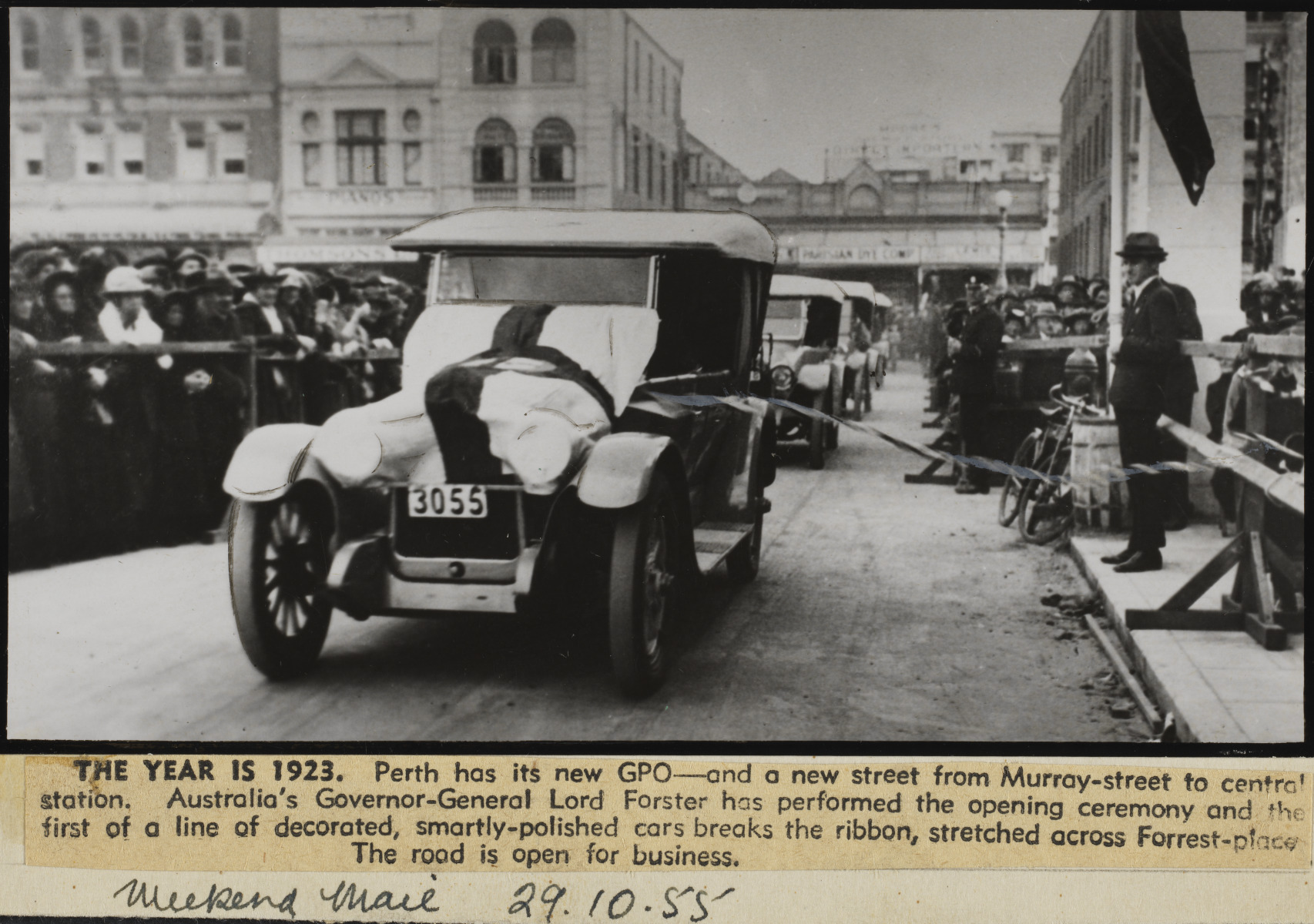 4689B/387: A car breaks a ribbon to open Forrest Place after the official opening by Lady Forrest, 26 September 1923