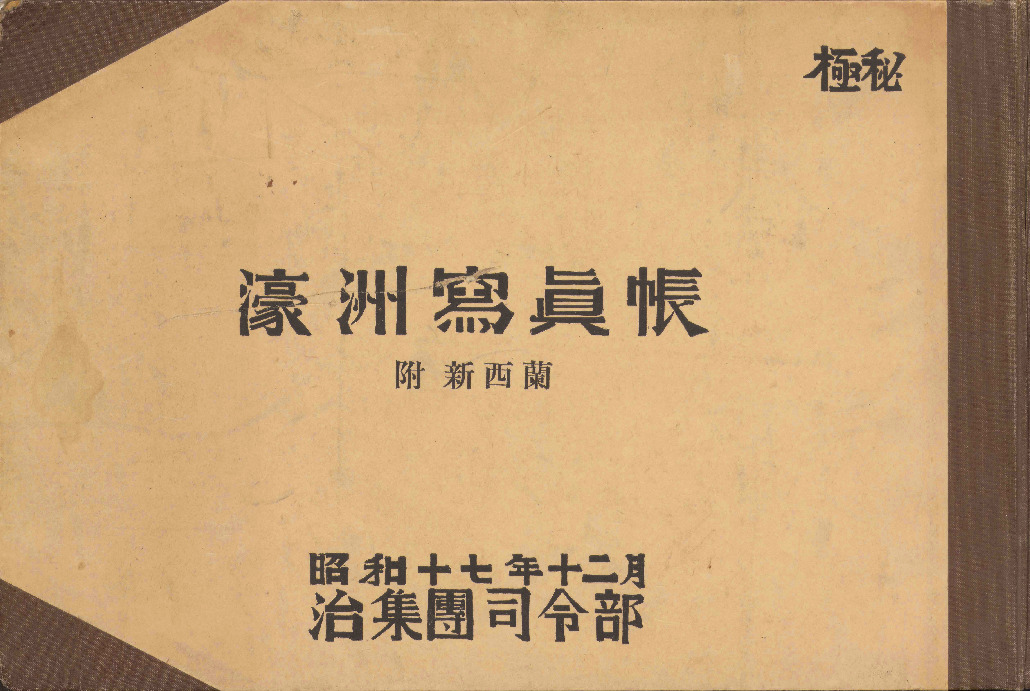 A rare album relating to the Japanese Imperial Army's plan to invade Australia and New Zeland during World War Two. Compiled and issued by the headquarters of the Japanese Rikugun in Jakarta. This book consists of reproductions of photographs of major geographical and topical features, major cities and industrial infrastructure, such as dams, mines, smelters and factories in Australia & New Zealand, as well as of vertical aerial photographs: five aerial photographs of Darwin and four of Bathurst Island, both in the the Northern Territory, taken by Japanese, and 52 other aerial photographs of Ballarat area and Mornington manoeuvre area, Victoria, dated 1937 and 1938 at the end of the book include the acronym CAS, indicating they were taken by Commonwealth Aviation Services. Reduced images of maps of Australian states and territories and of New Zealand, are included as foldouts; among them is a 1941 map of Canberra. The maps are annotated to indicate the locations of the various photographed features. The photographs seem to be copied from commercially available sources, including government and private industrial publicity brochures. The book was intended for the use of Imperial Japanese Army and Air Service personnel as an aid to identifying targets of strategic importance in Australia and New Zealand. These targets could potentially be destroyed either through bombing raids or in an invasion by Japanese ground forces. One of the most highly targeted areas was Mornington and its environs; there are also numerous aerial views of Darwin and Broome, which were both bombed by the Japanese.