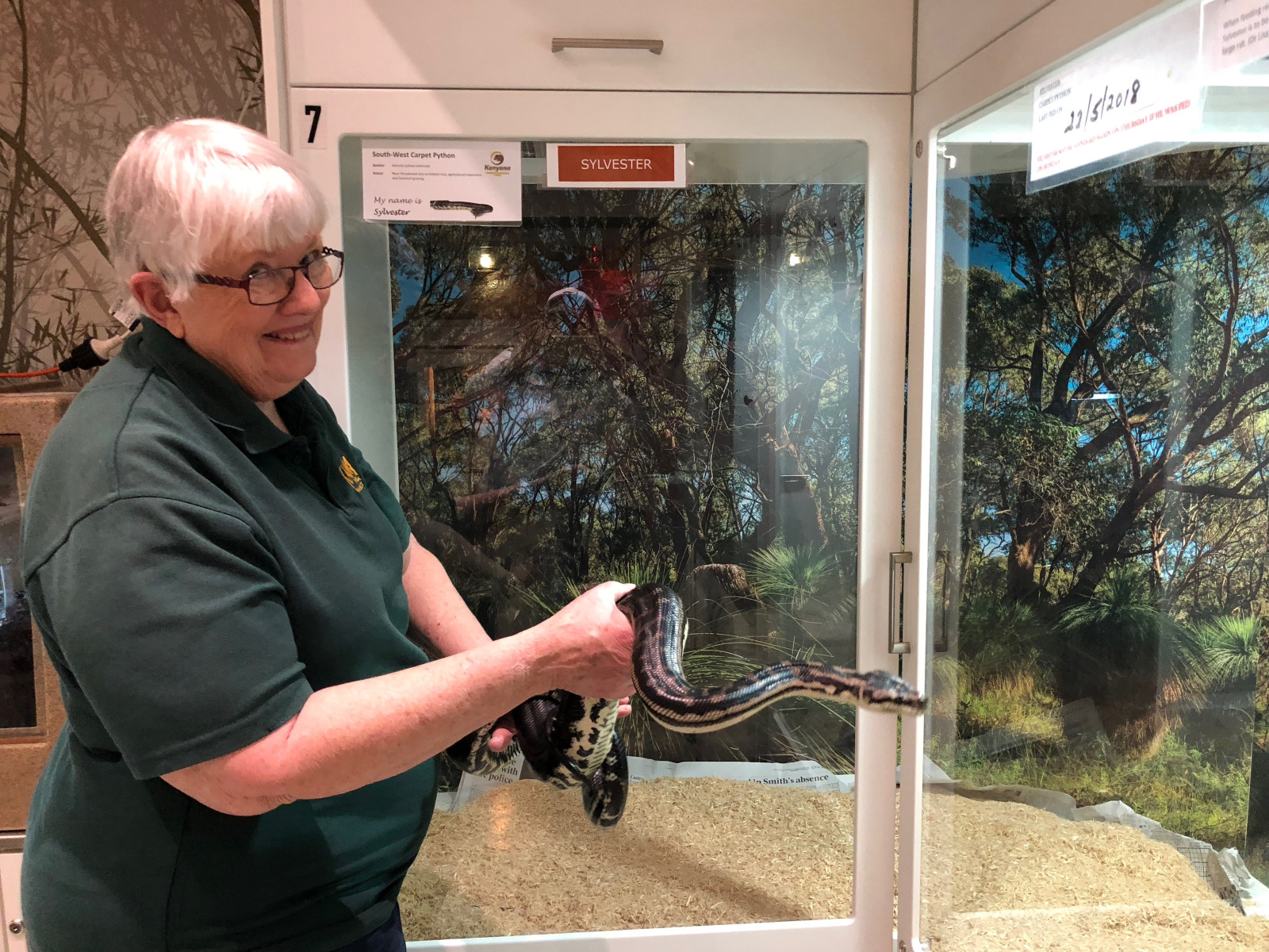 BA3408/5: Barbara Wright and Sylvester the python at Kanyana Wildlife Rehabilitation Centre, Lesmurdie, 25 June 2018