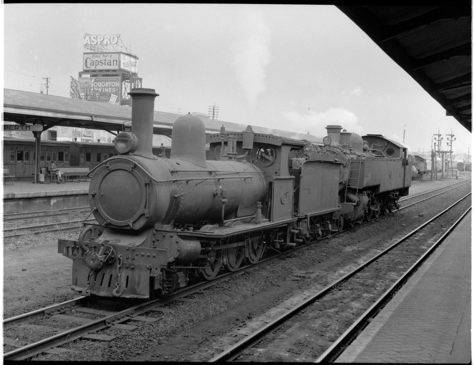 383042PD: WAGR G class No.131 and Dd class No. 594, Perth Railway Station, May 1951.