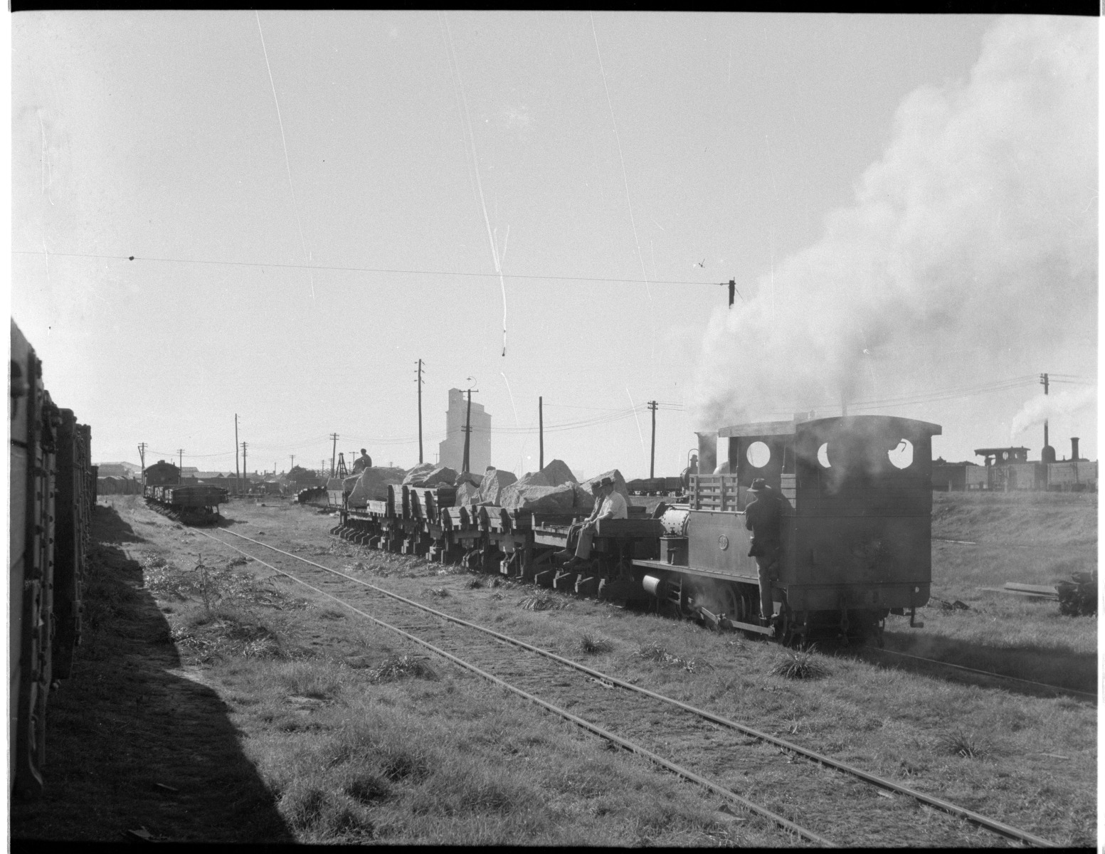 383046PD: WAGR H class No.18, owned by Public Works Dept, on stone train for Bunbury breakwater, Bunbury, May 1951.
