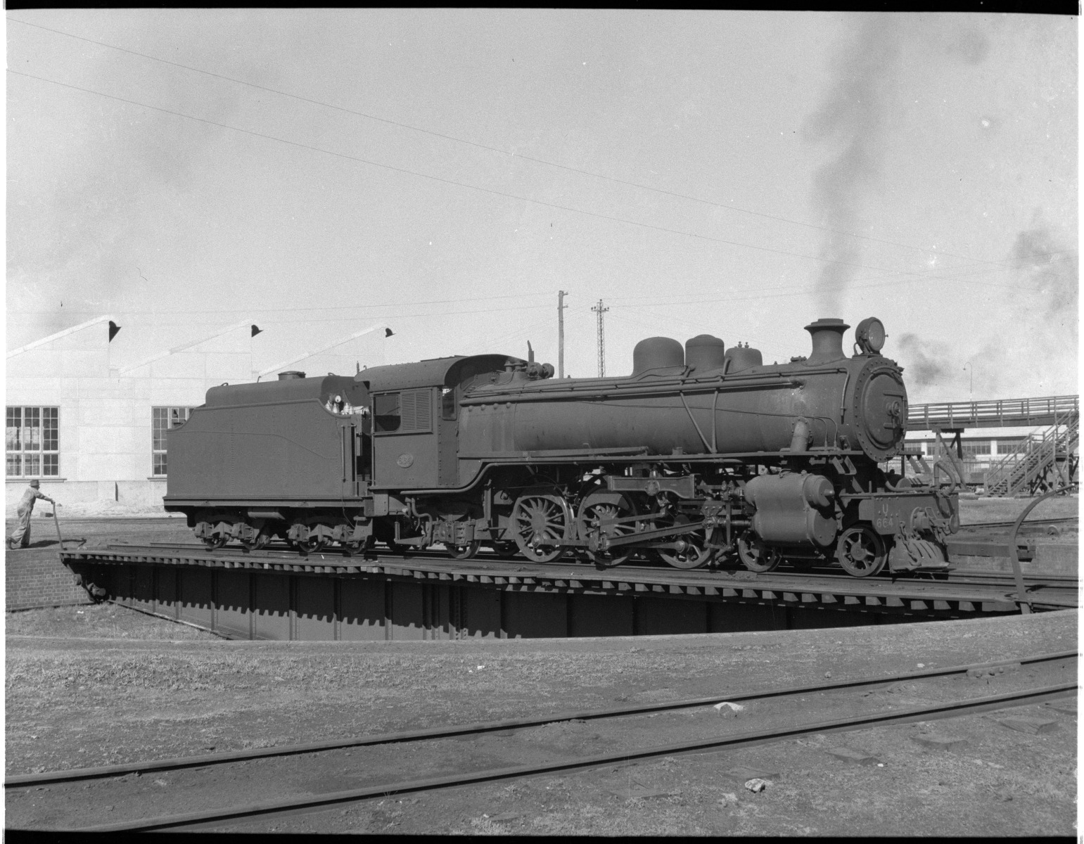 383055PD: U class No.664 on turntable, East Perth locomotive Depot, East Perth locomotive Depot, May 1951.