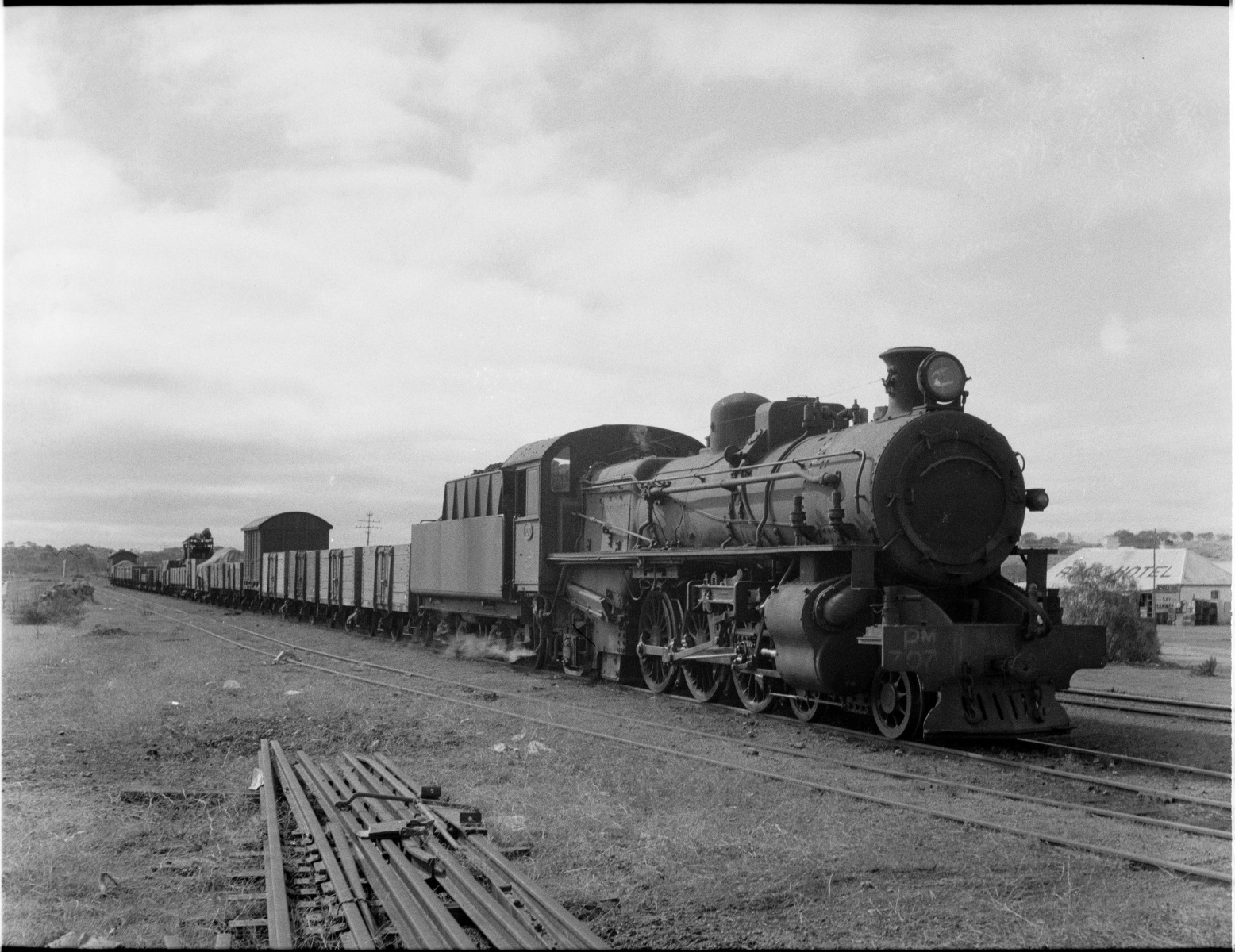 383057PD: Pm707 on an Up goods train in the loop at Bullabulling, crossing the Kalgoorlie passenger, Bullabulling, May 1951.
