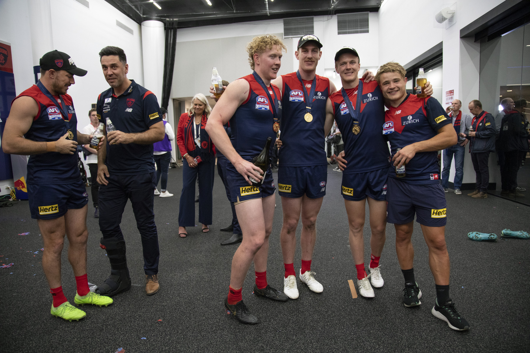BA2493/3077 : Melbourne players pose for a photograph, left to right Michael Hibberd, assistant coach Troy Chaplin, CEO Kate Roffey, Clayton Oliver, Jake Lever, James Jordon and Kyle Chandler