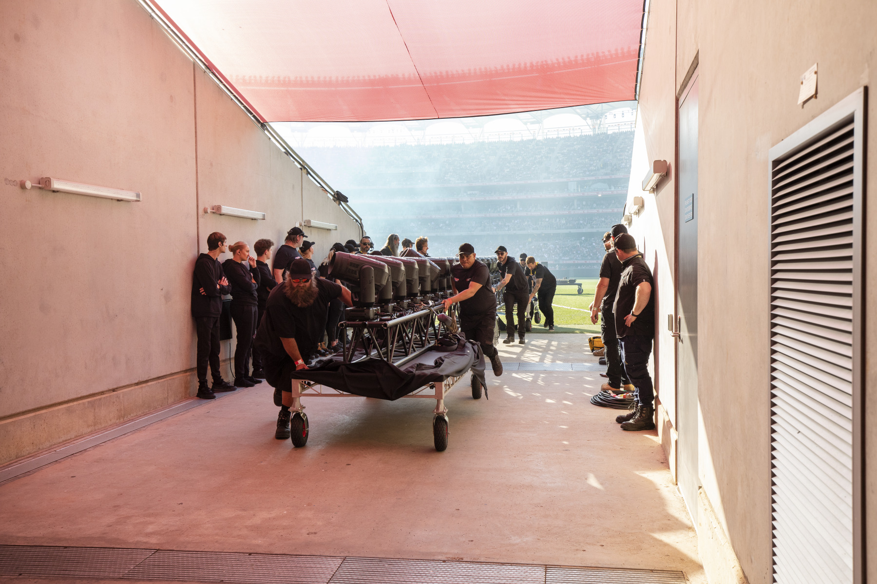 BA2493/3119 : Crew wheeling off a bank of lights used in the pre-game entertainment performances