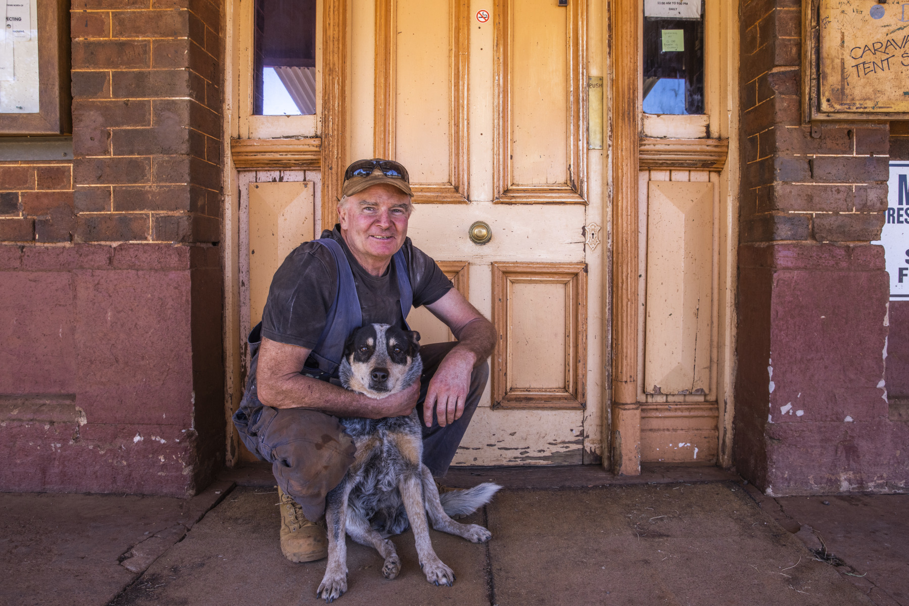 BA3424/224: Barry Shanahan with his dog Dick at the entrance to the Grand Hotel, Kookynie, September 2021