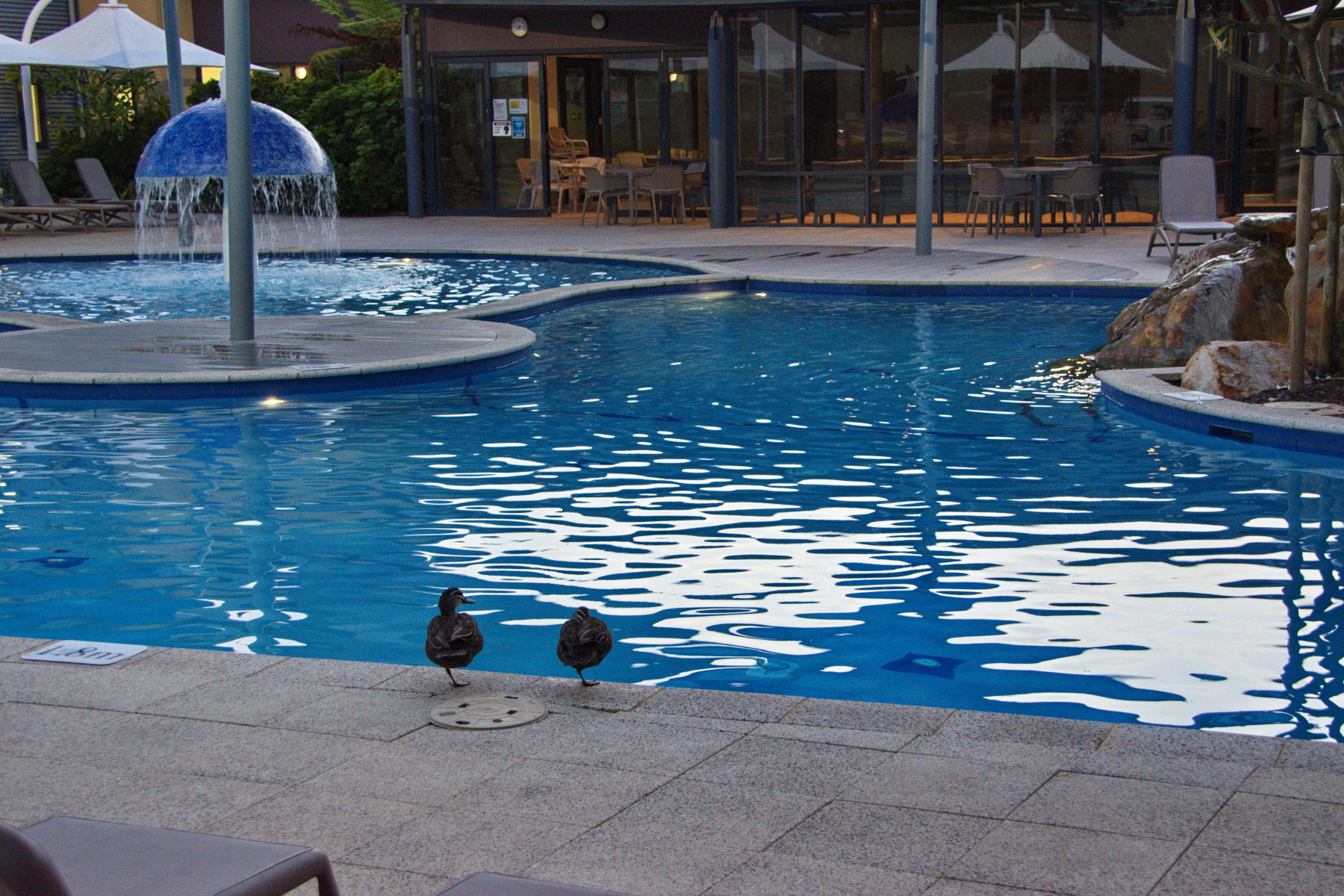 BA2671/322: Ducks beside the pool of the Sebel Busselton Hotel, 17 March 2022