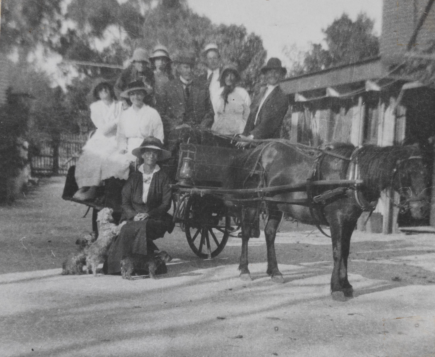 BA1101/10/102: Back: Frank Le Souef, Nancy Le Souef, Perce ?; Middle: Rini Curtis, Miss Voysey, Ernest Le Souef (driving), Bea Parkin, Leslie Le Souef; Front: Ellie Le Souef
