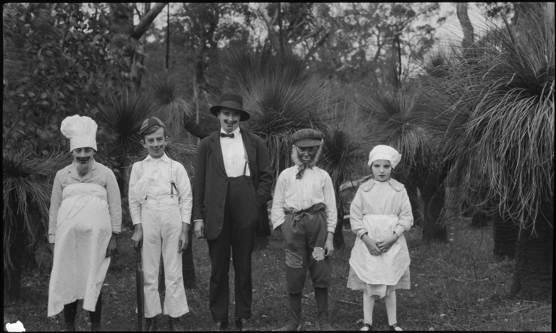 242623PD: School children in costume for a play performance, Lewis and Reid No. 2 Mill, near Allanson, Western Australia, ca. 1920. (L-R) Roy Udy, Ted Trautman, Elsie Udy, Louie Woods, Ivy Woods.