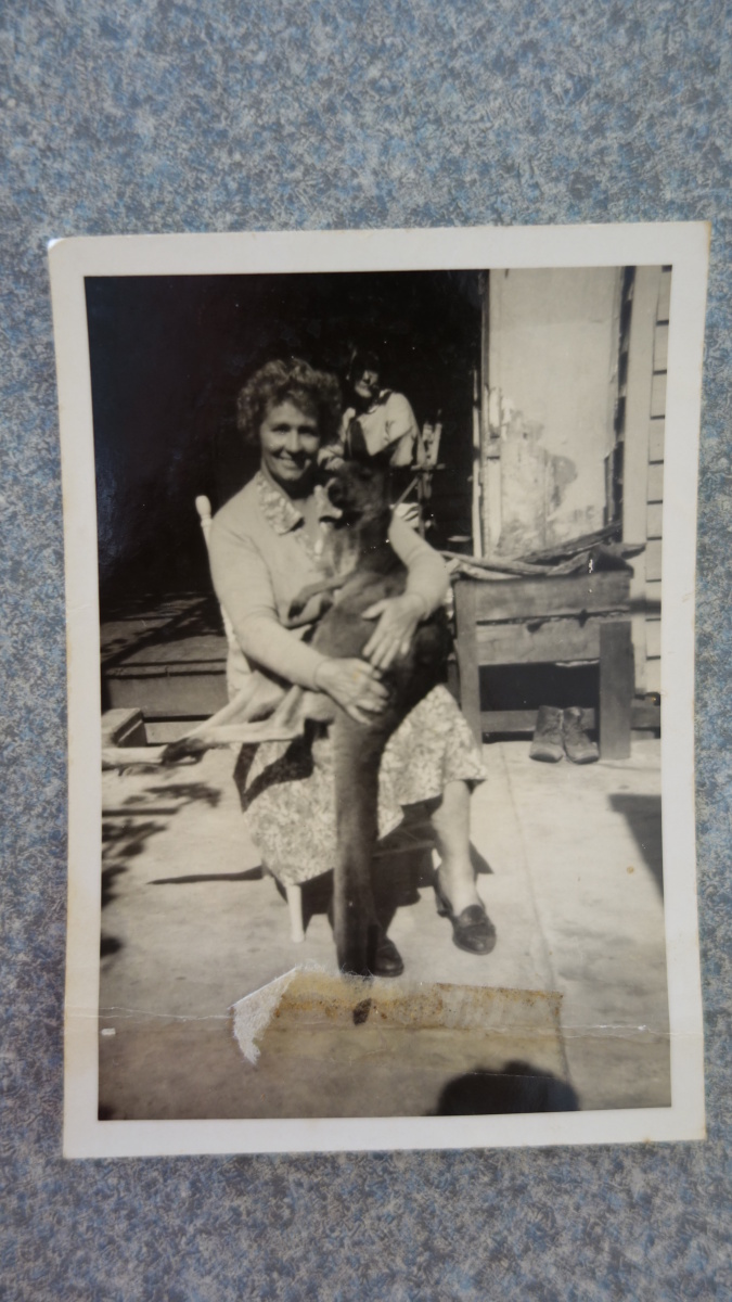 Apple innovator Maud Williams with pet kangaroo at Boronia Farm, Donnybrook Western Australia