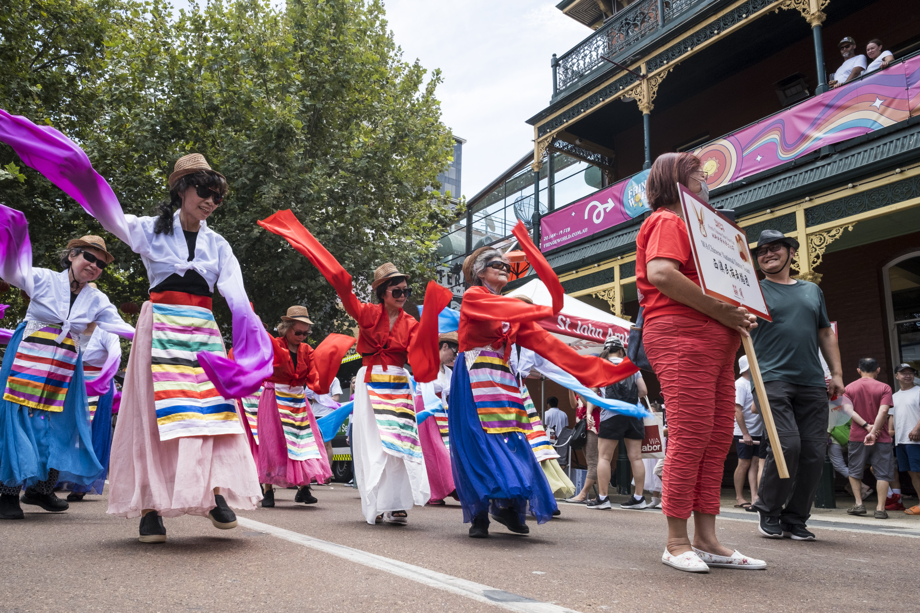 BA3370/124 : The WA Chinese National Dance Group were a colour addition in their colourful long sleeves which they waved as they walked in procession