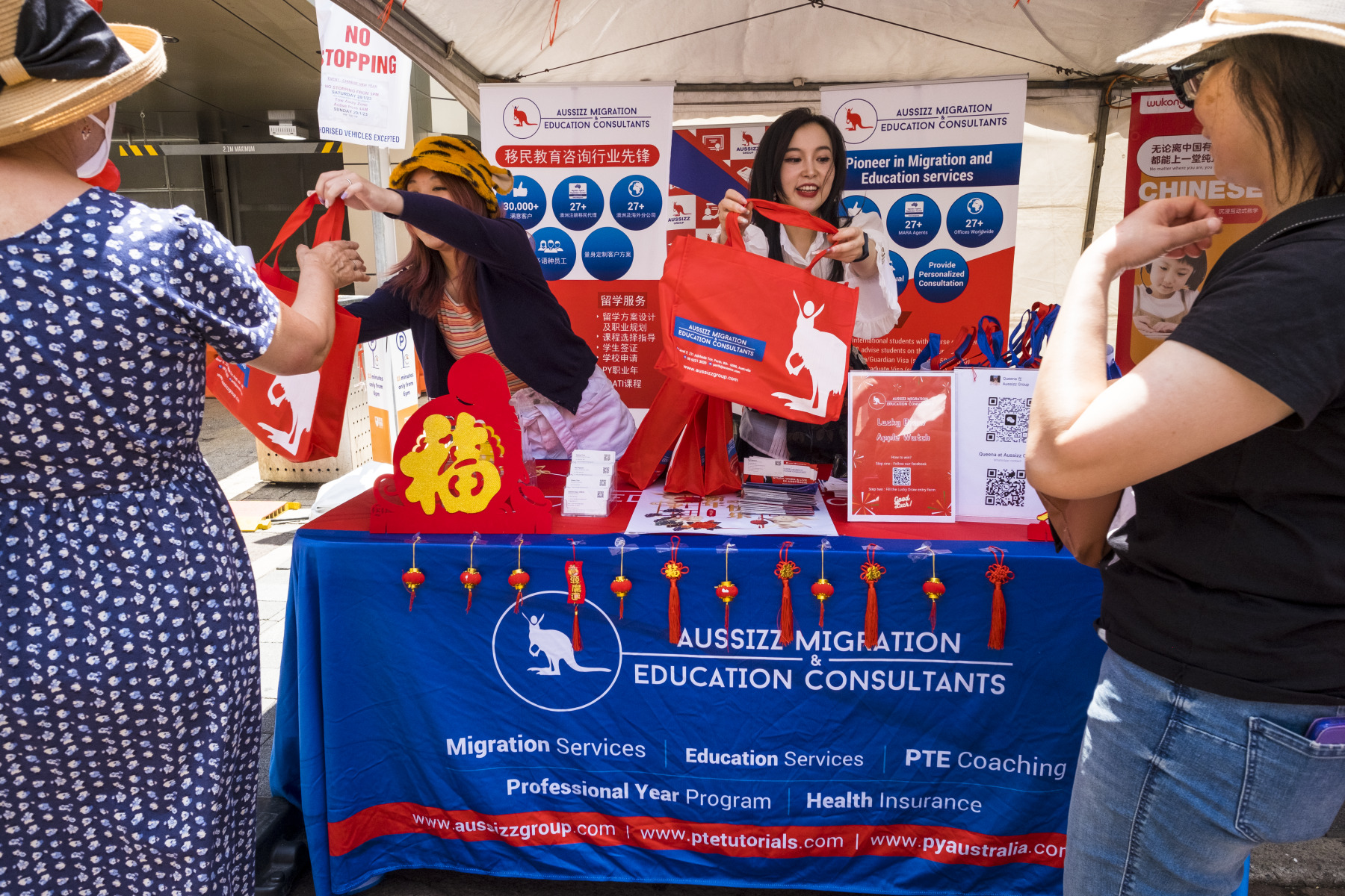 BA3370/115 : The Perth Chinese New Year Festival in 2023 closed off part of James Street which was lined with food and drink vendors, and stalls like this promoting education migration