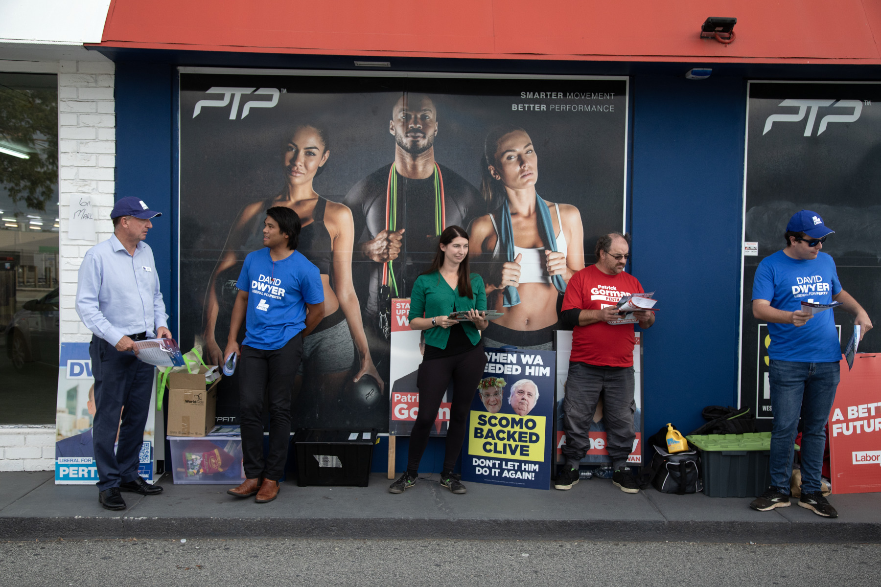 BA2493/3179 : Liberal candidate David Dwyer, far left, canvasing outside a pre-polling station on Russell Road, in Morley, in the Perth electorate, with Liberal and Labor volunteers and Greens candidate Caroline Perks, 17 May 2022