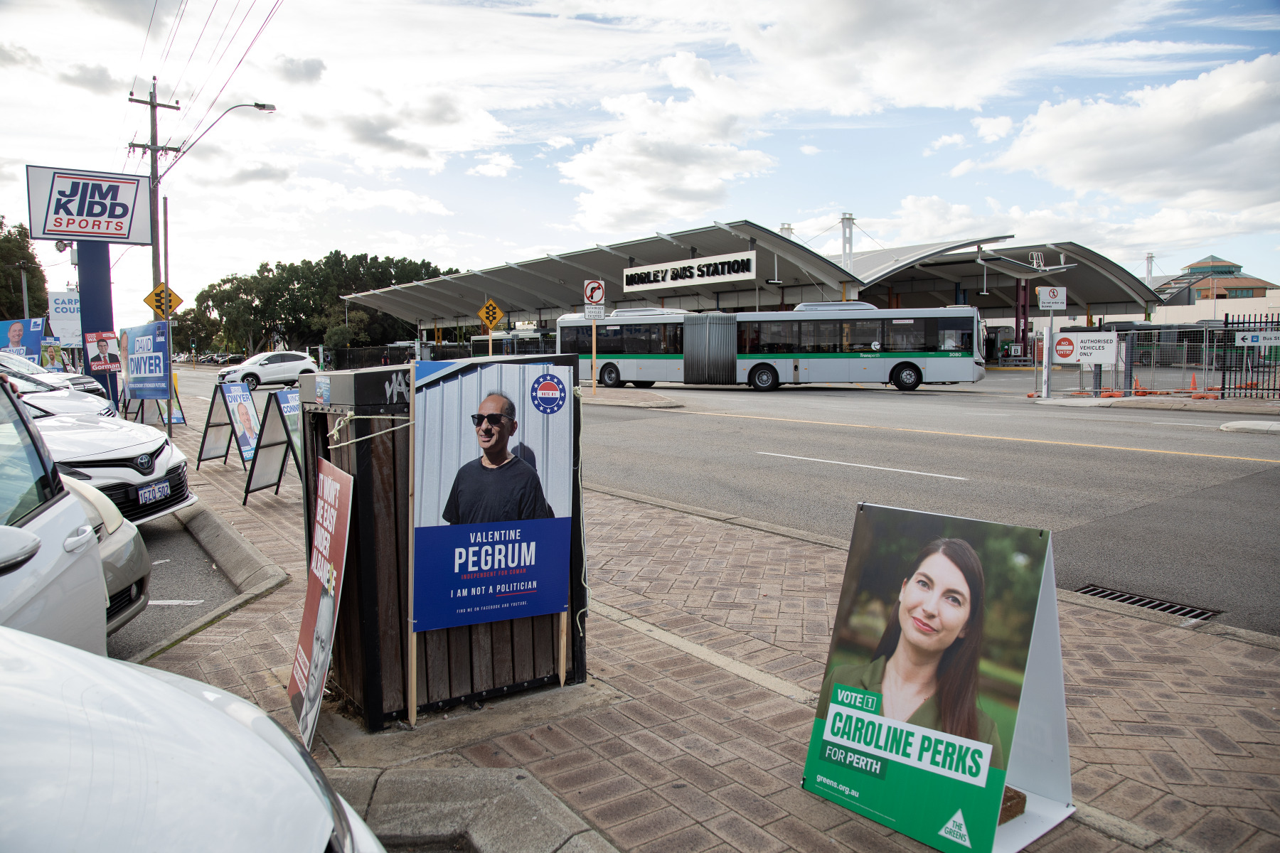 BA2493/3181 : Perth electorate candidate advertising outside a pre-polling station on Russell Road, in Morley, opposite the bus station, 17 May 2022