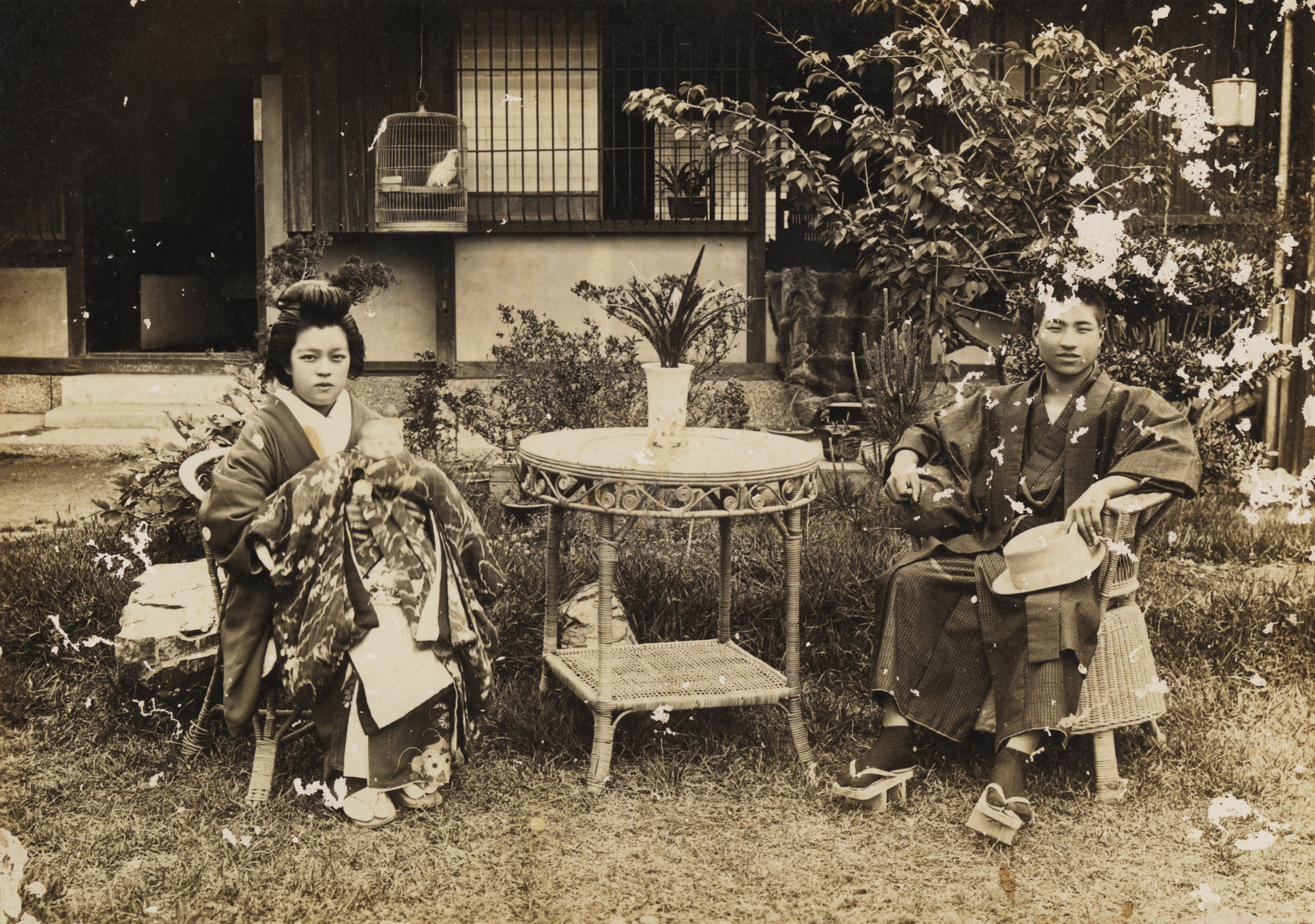 ACC 10824AD/65: Keiko & Ikuko? Yamamoto in traditional dress, sitting in a garden with a caged cockatoo.