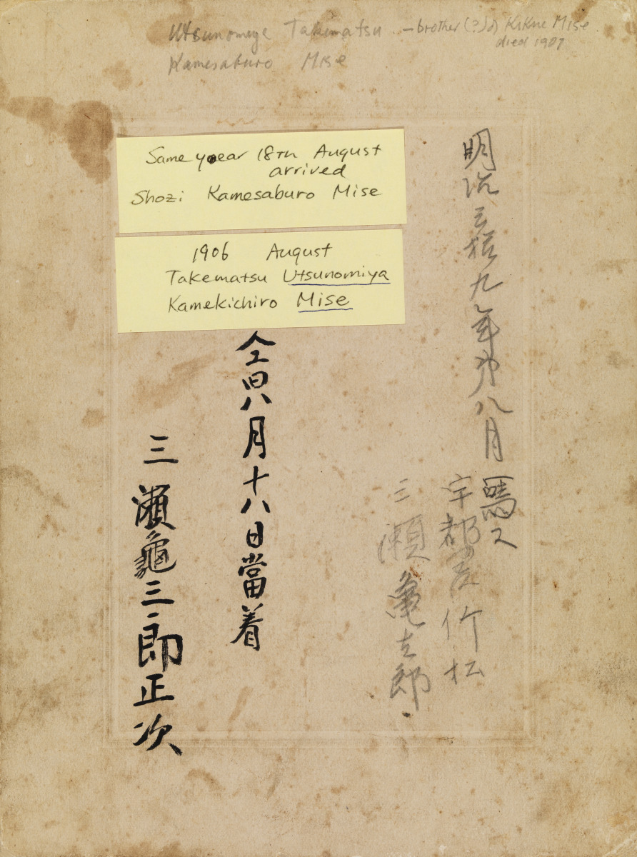 ACC 10824AD/66: Kamesaburo Mise and Takematsu Utsunomiya, 1906. Verso.