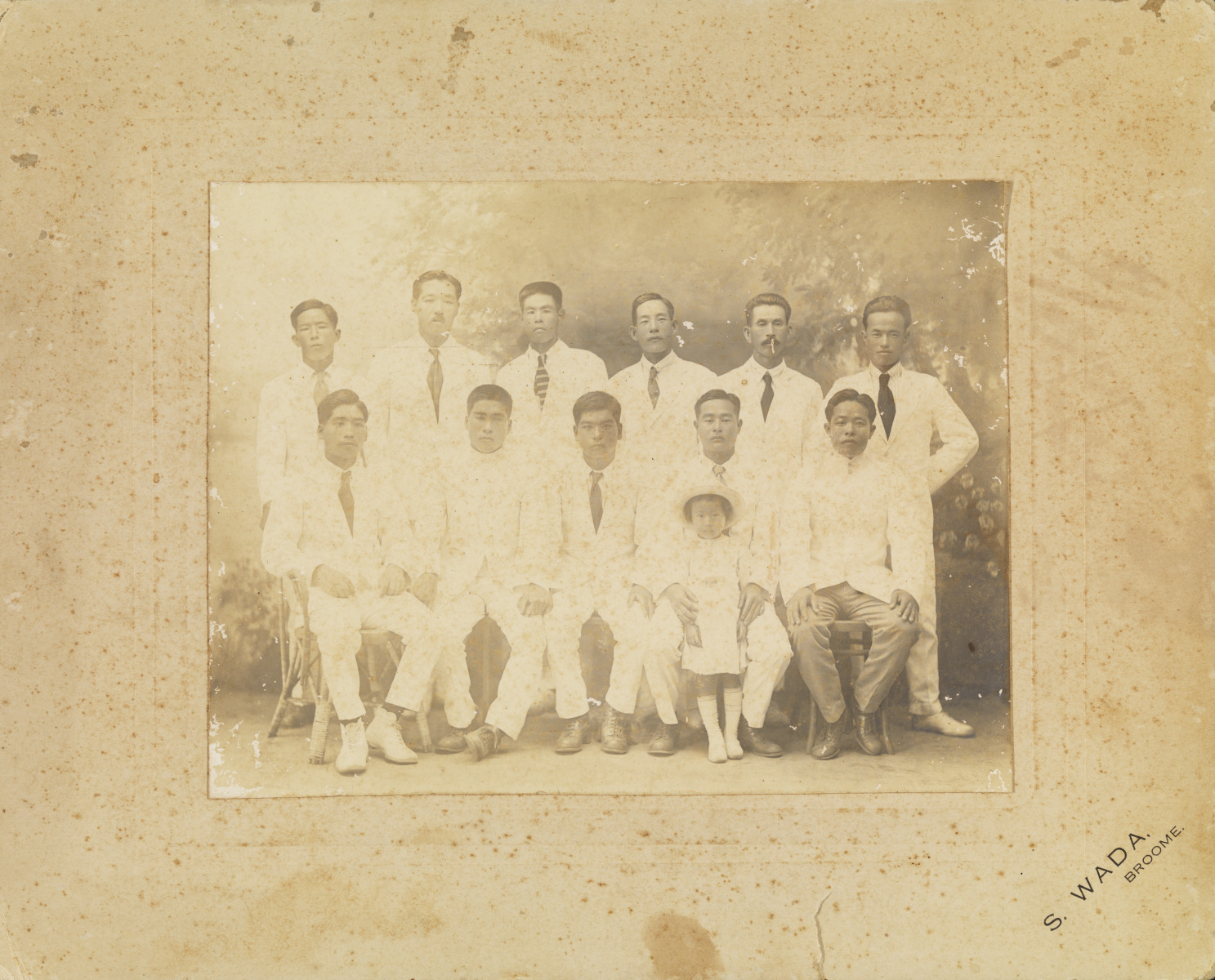 ACC 10824AD/43: Studio group portrait. 11 men, one child. Wearing white outfits.