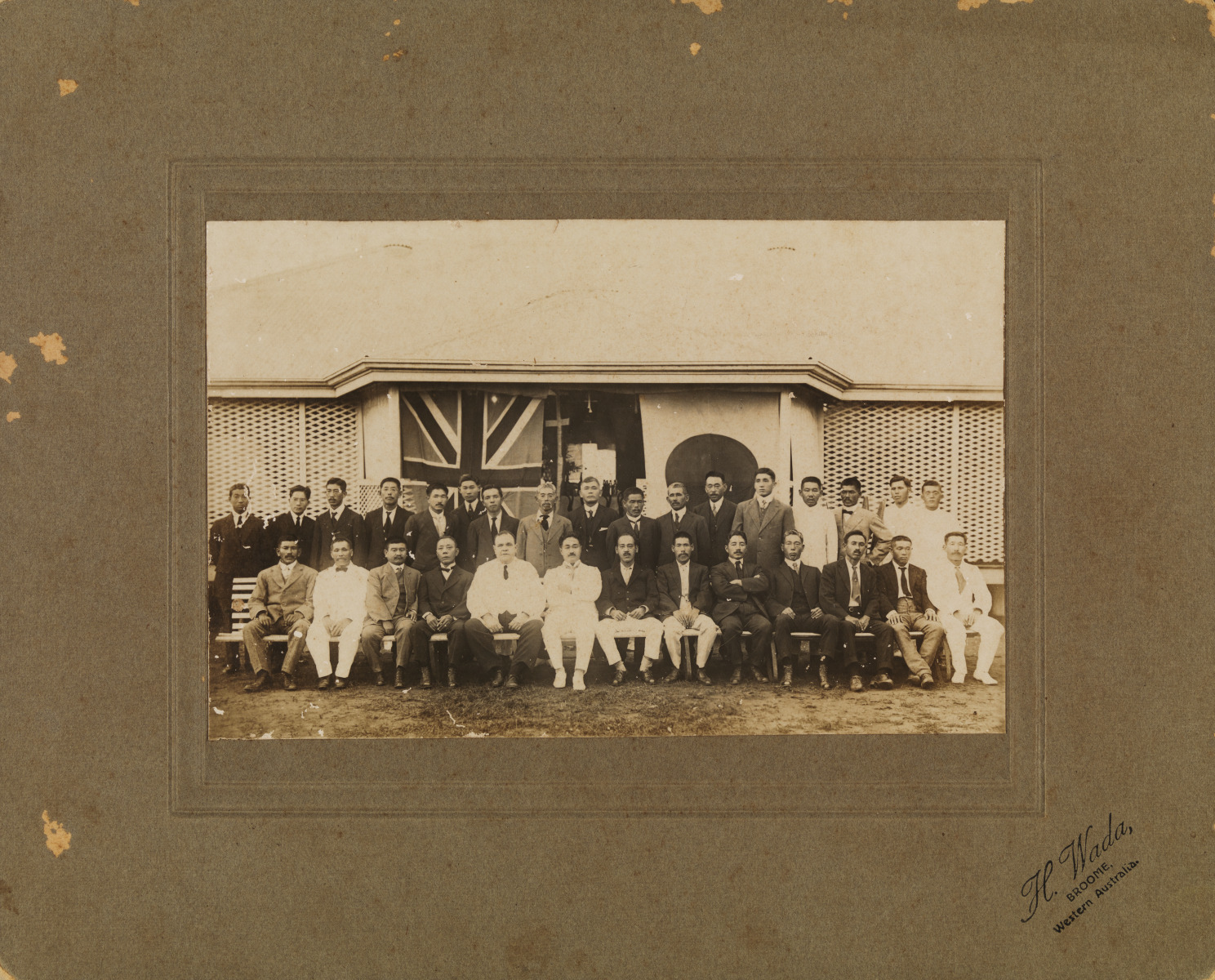 ACC 10824AD/48: Group in front of the Japanese hospital with British and Japanese flags. Doctor Masuyama (centre front) in white, with Dyson on his right and Murakami Y on his left, Broome, c. 1921-1925.