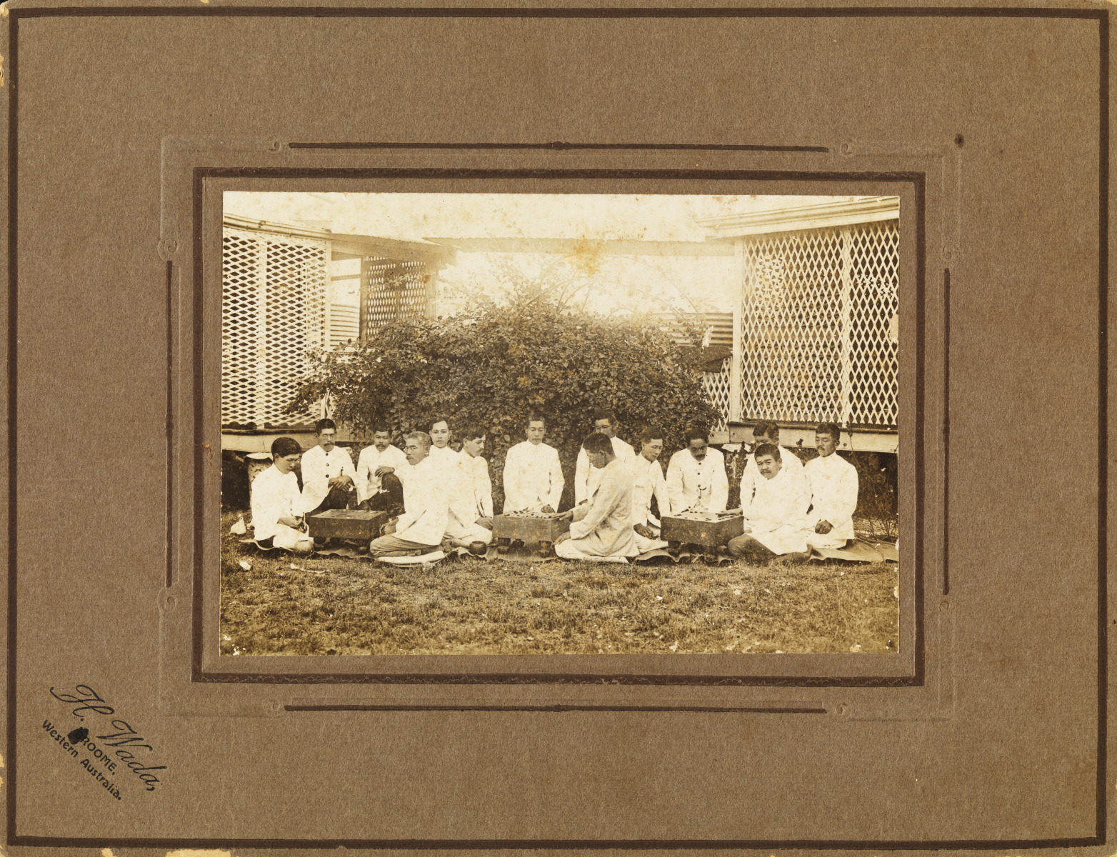 ACC 10824AD/49: Three pairs of men playing board game of Go. Toyosaburo Mise (4th from left, Kaichiro Sakai (2nd from right front) with onlookers, Broome, pre-1926.