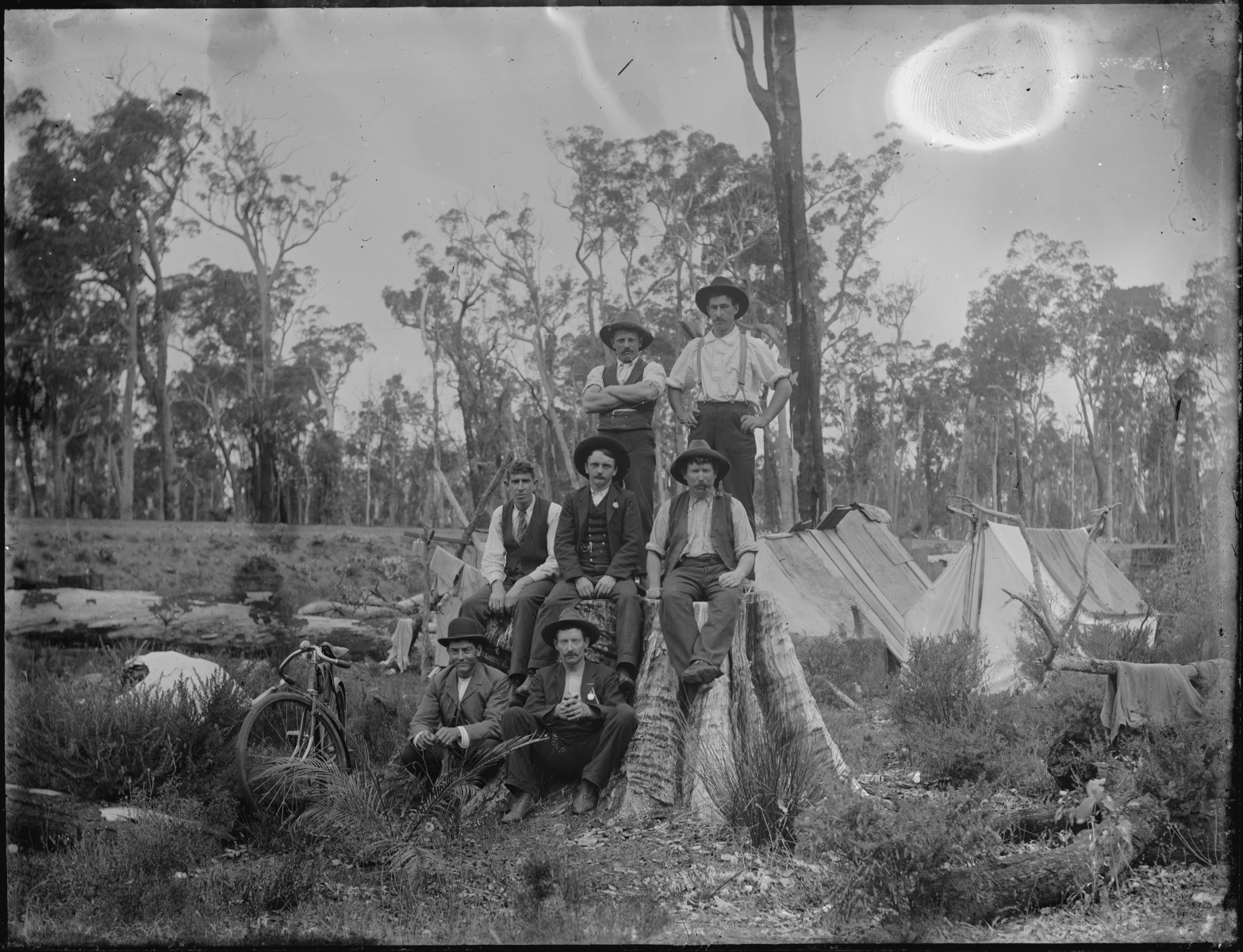 019164PD: A group of men in a bush camp in the Harvey Region of Western Australia, ca.1910