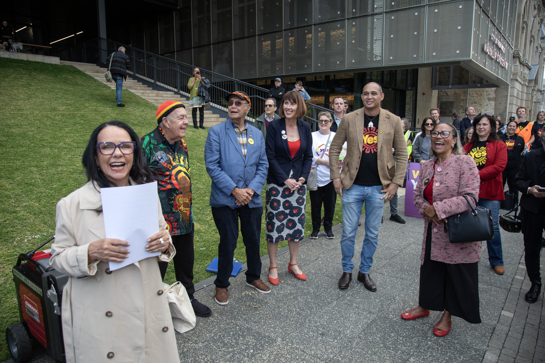 BA2493/3292: L-R: Linda Burney MP, Dr Gerrard Shaw, unidentified man, Fremantle Mayor Helen Fitzhardinge and Yes23 spokesperson Thomas Mayo, unknown women, Fremantle, 19 September 2023