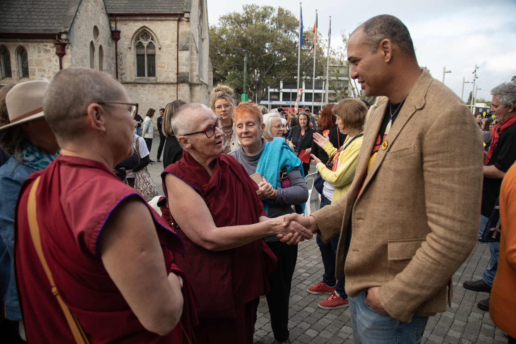 BA2493/3293: Tibetan Buddhist nun the Venerable Thuben Chokyi meeting Yes23 spokesperson Thomas Mayo at the end of the event in support of the Voice to Parliament held in Fremantle, 19 September 2023