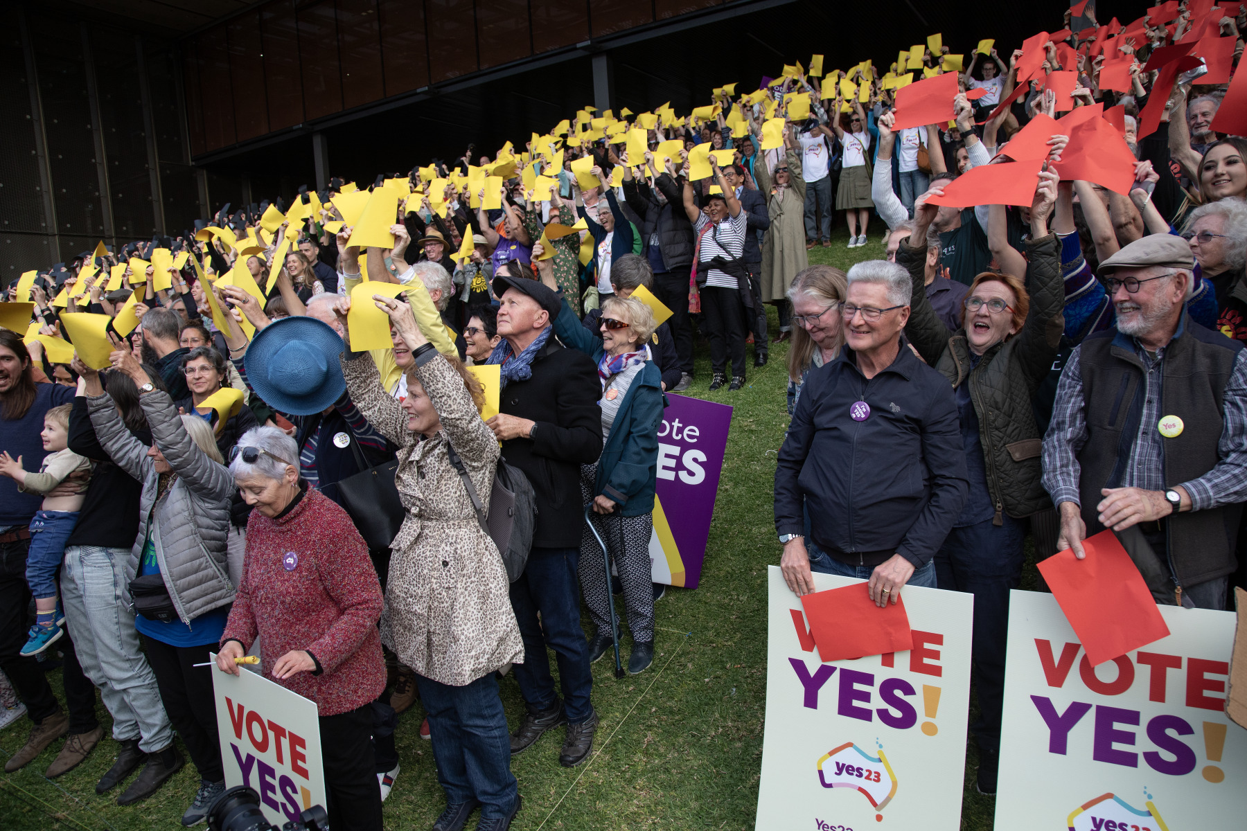 BA2493/3294: The crowd hold coloured cards in preparation to forming the letters YES for a drone shot over the Yes23 event held in Fremantle, 19 September 2023